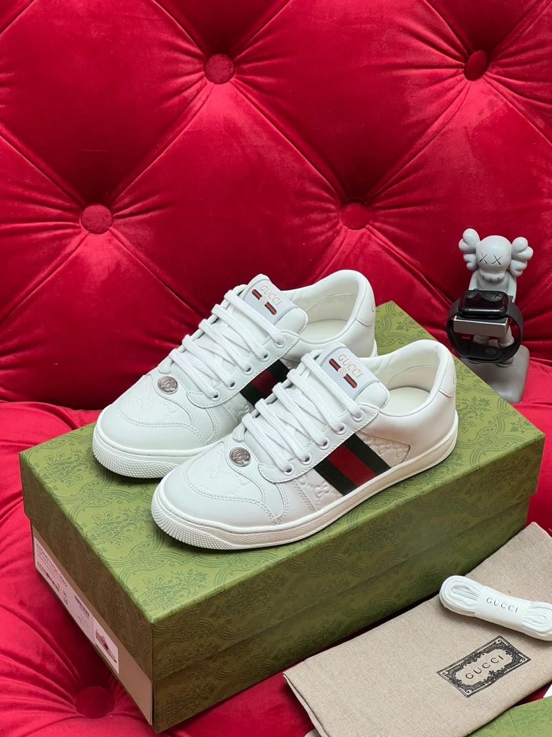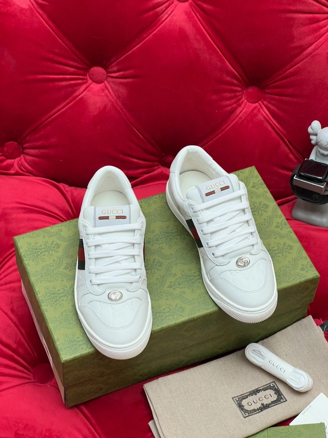 Selling a pair of Gucci sneakers in white leather. They are in great condition and come with the box and accessories. A stylish addition to any wardrobe!