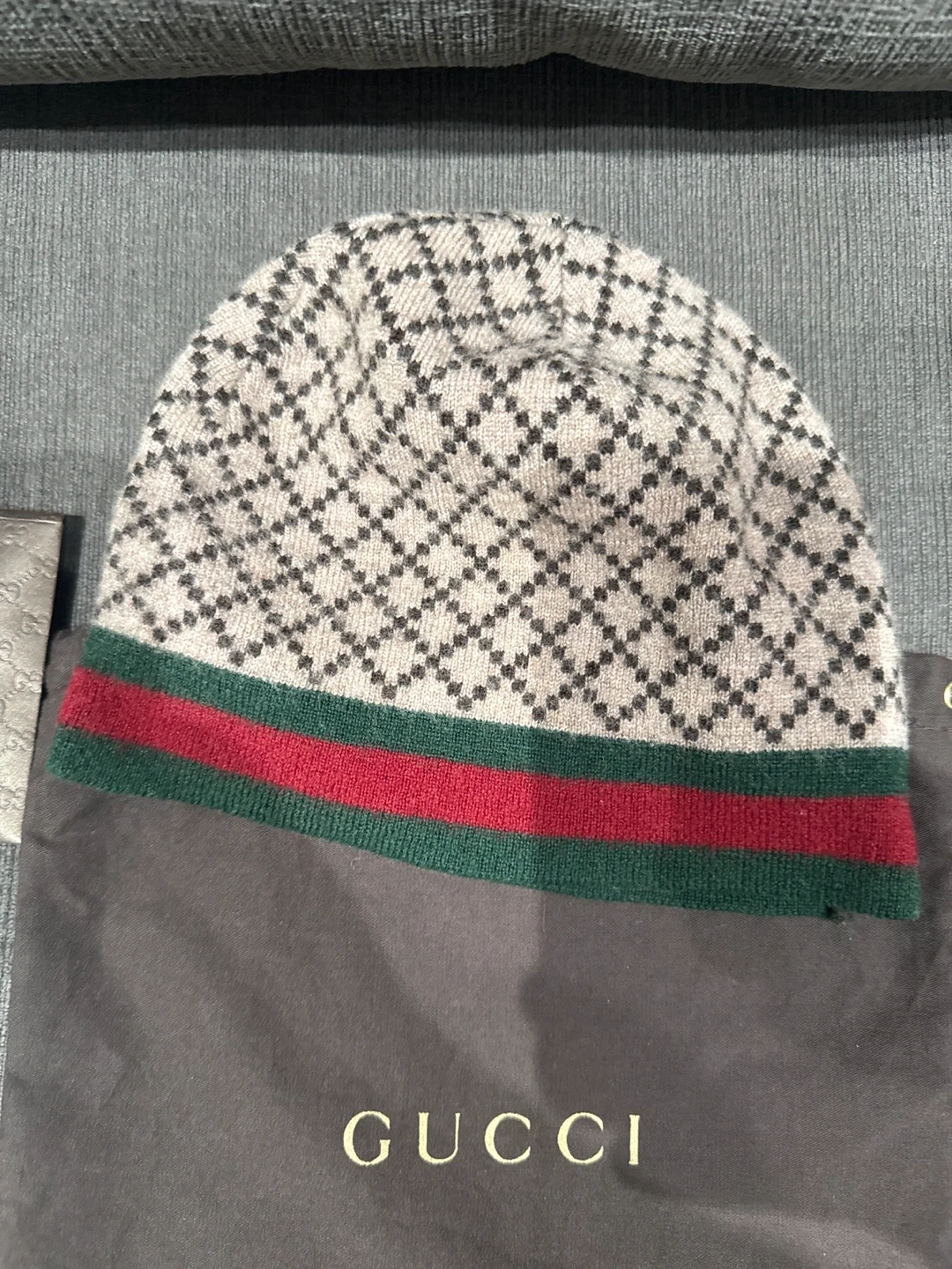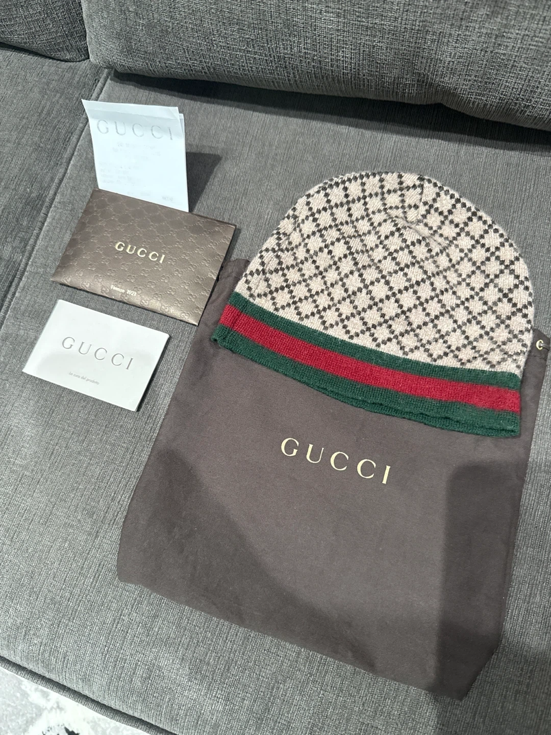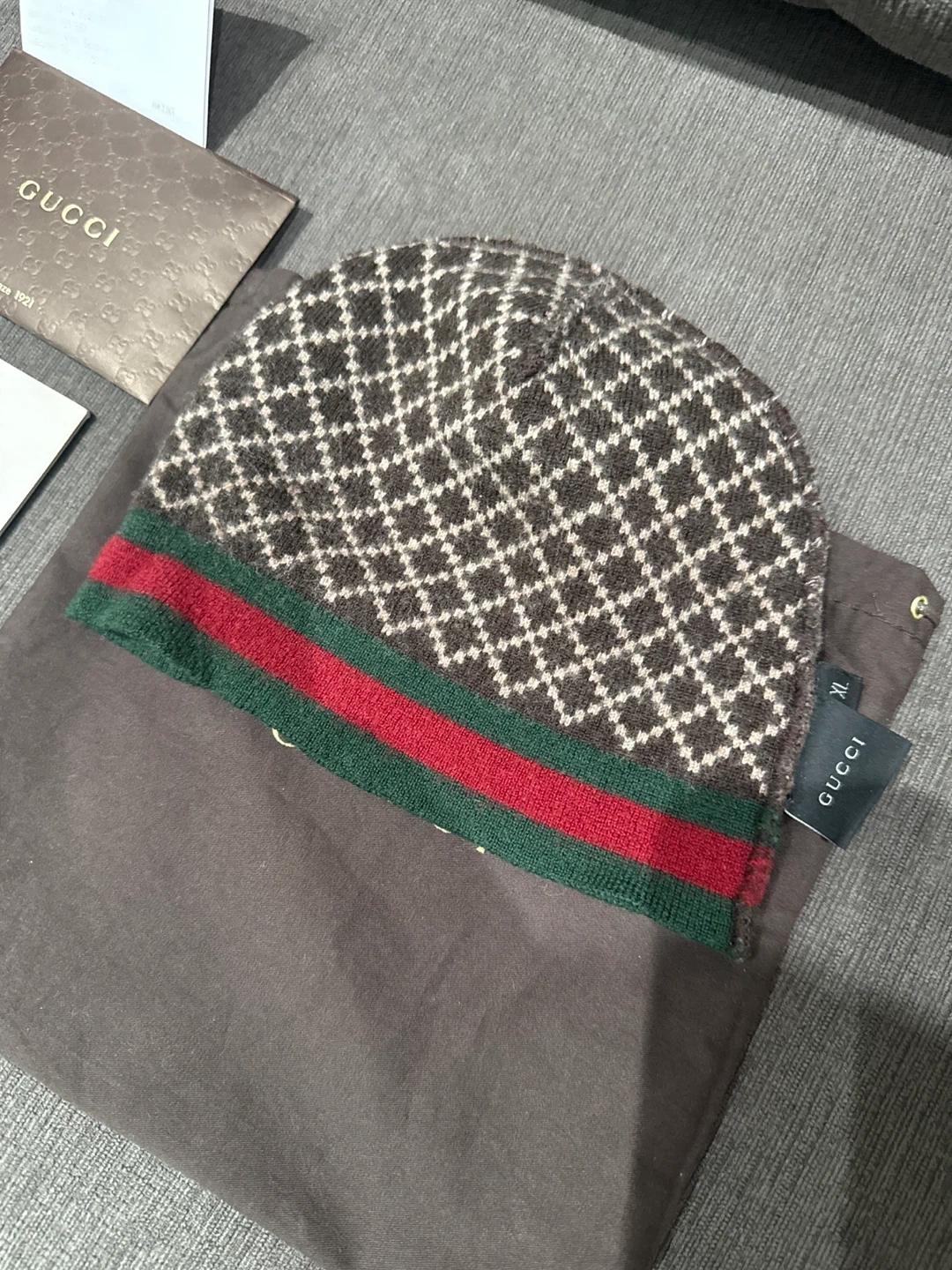 Selling a Gucci wool beanie hat in size XL! It features a stylish pattern and the classic Gucci stripe. Made in Italy from 100% wool. Comes with the original Gucci dust bag and cards authentic with the receipt