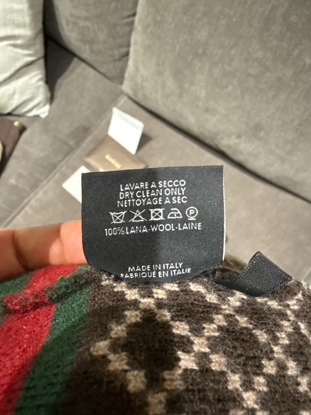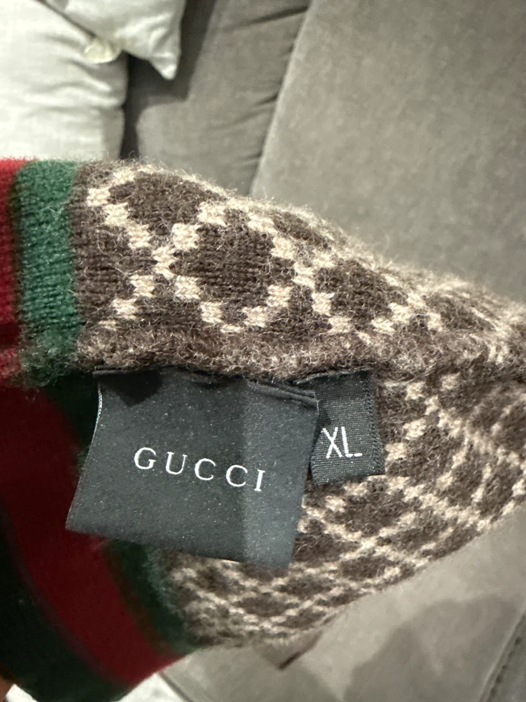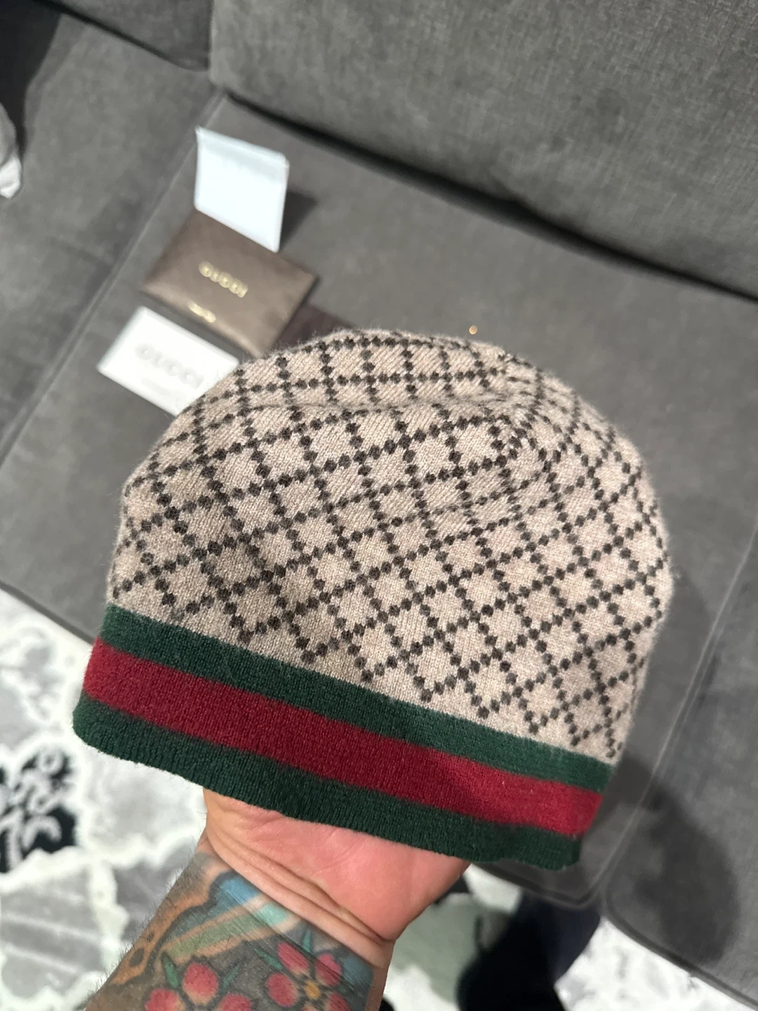 Selling a Gucci wool beanie hat in size XL! It features a stylish pattern and the classic Gucci stripe. Made in Italy from 100% wool. Comes with the original Gucci dust bag and cards authentic with the receipt