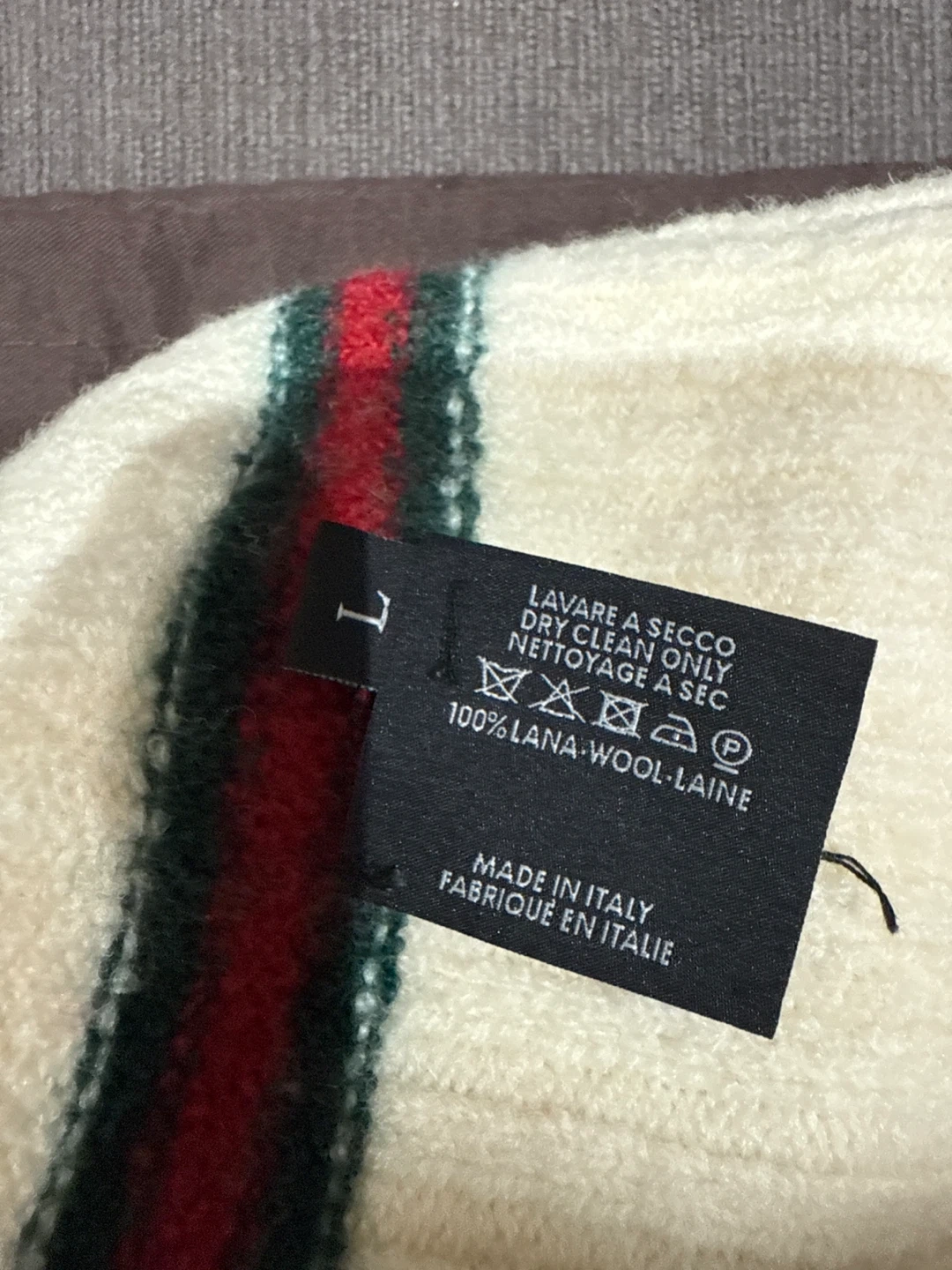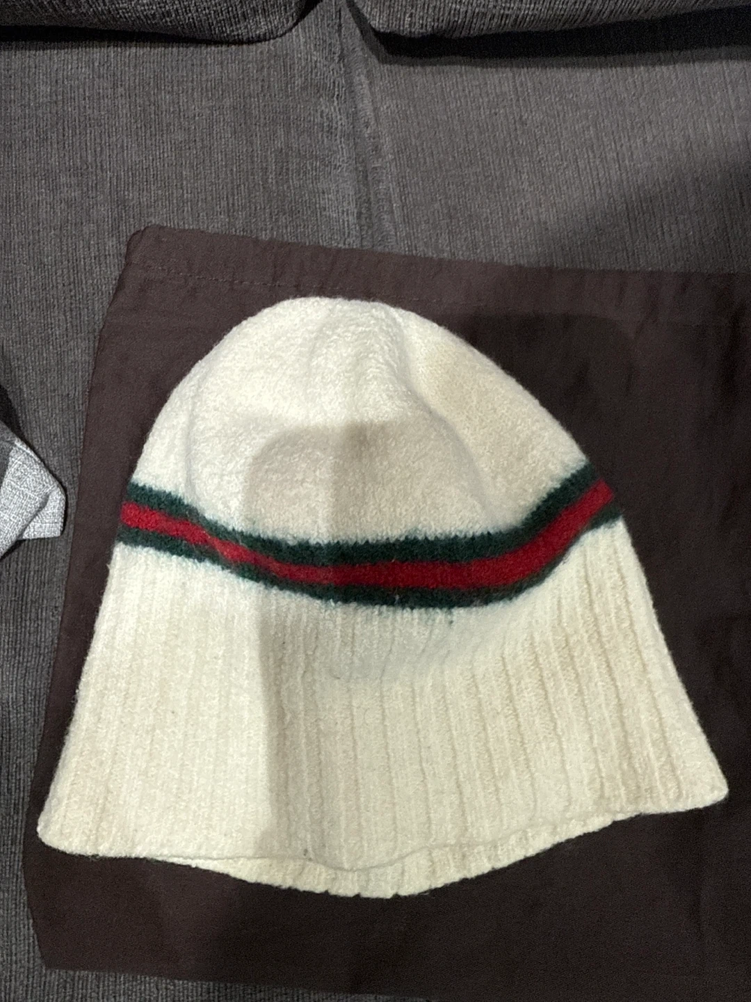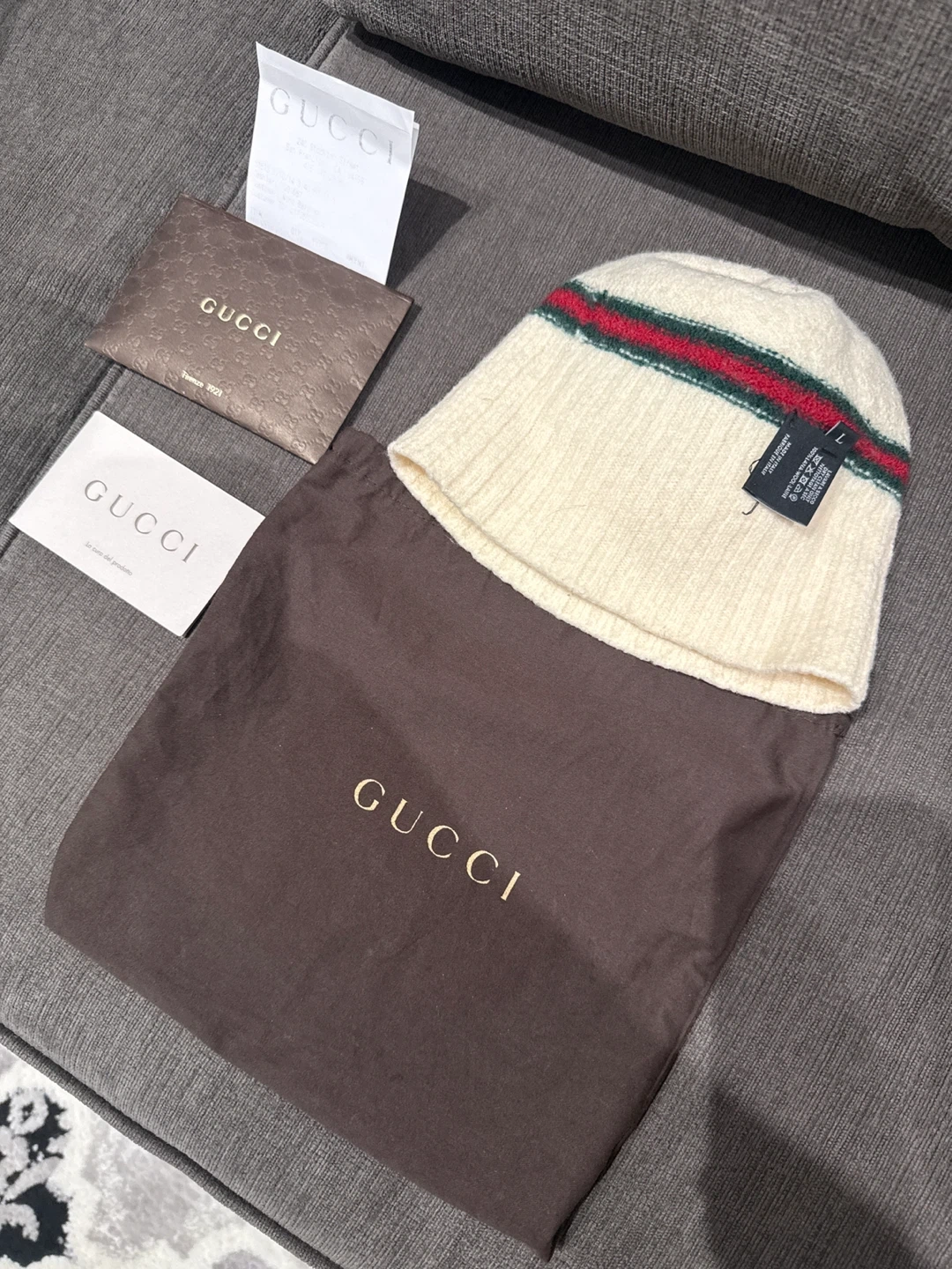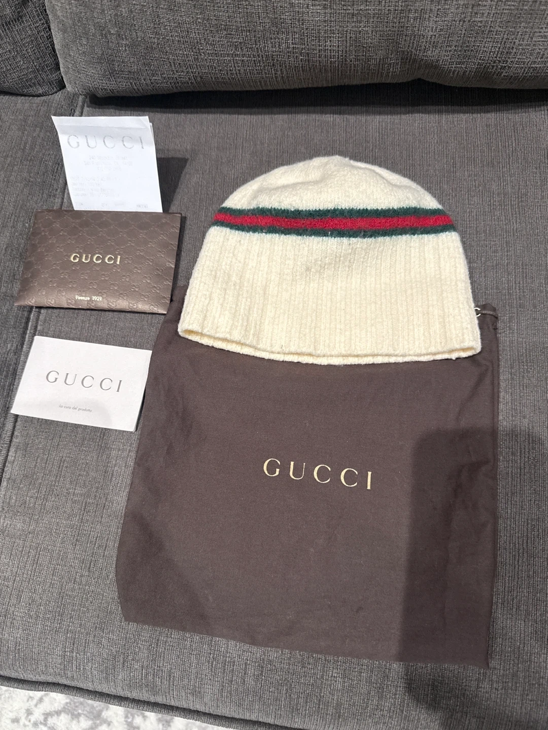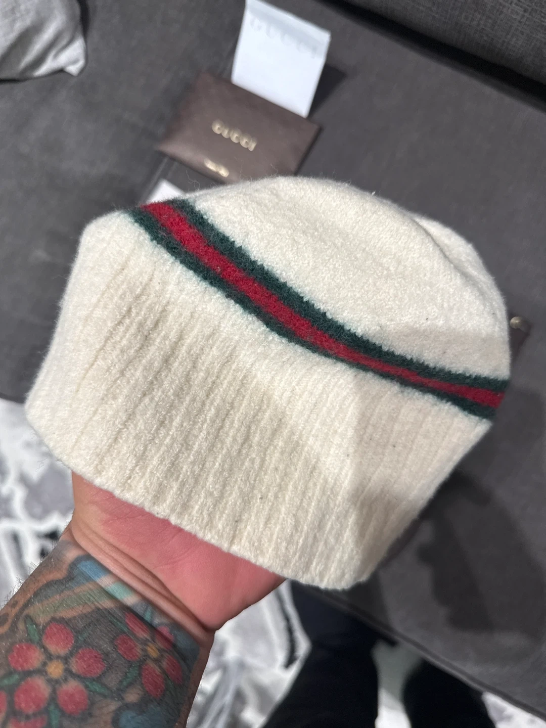 Selling a Gucci wool knit hat in size L. It's a stylish cream colour with the classic Gucci stripe. The hat is made in Italy from 100% wool. Comes with the original Gucci dust bag and cards!