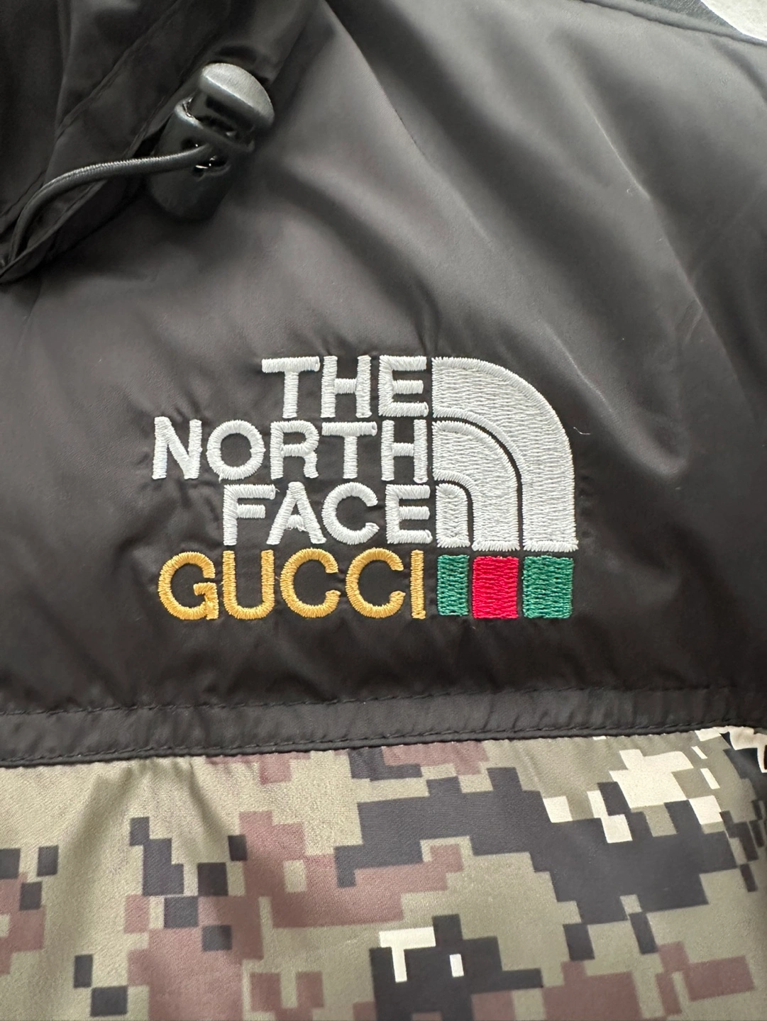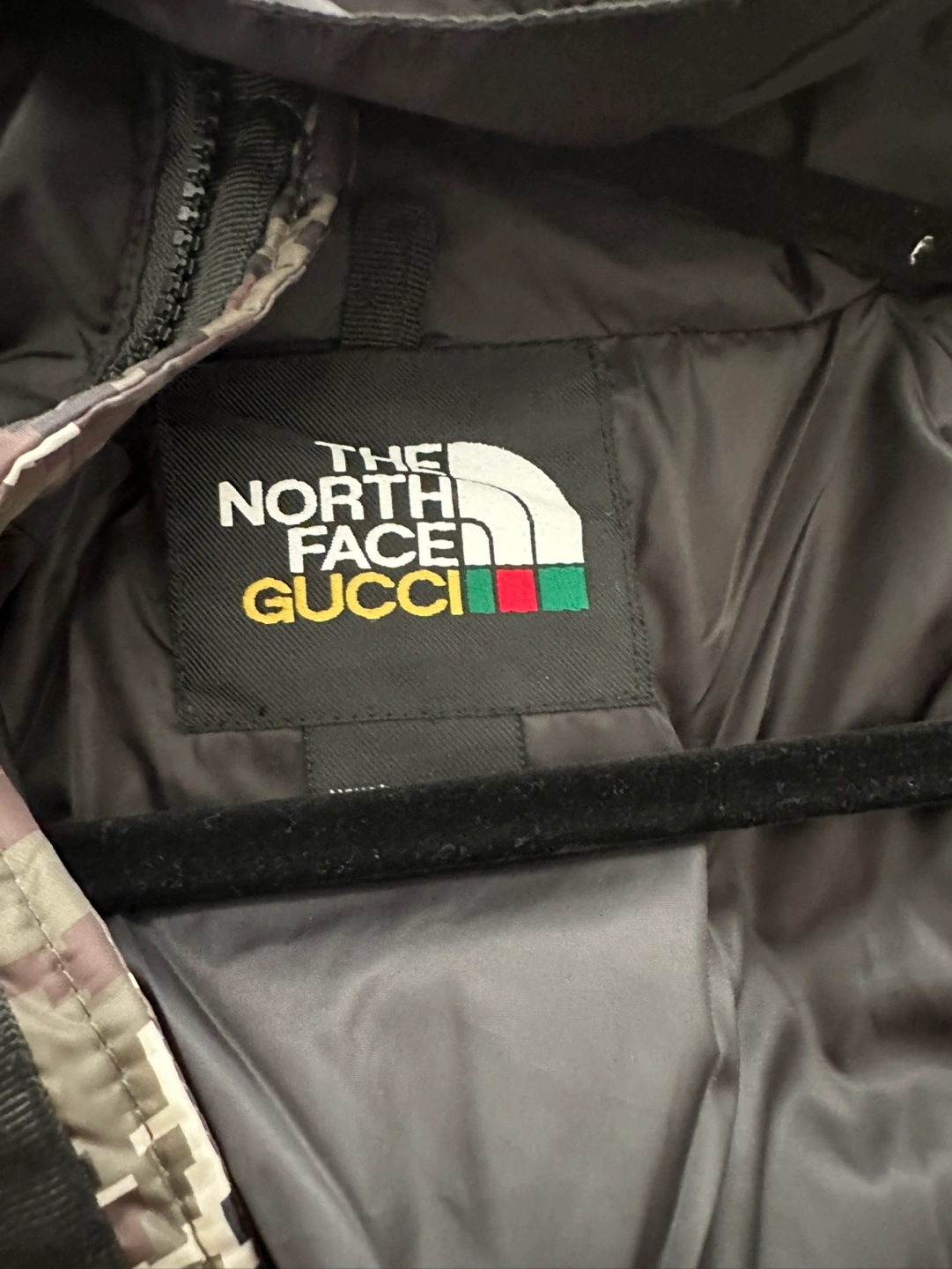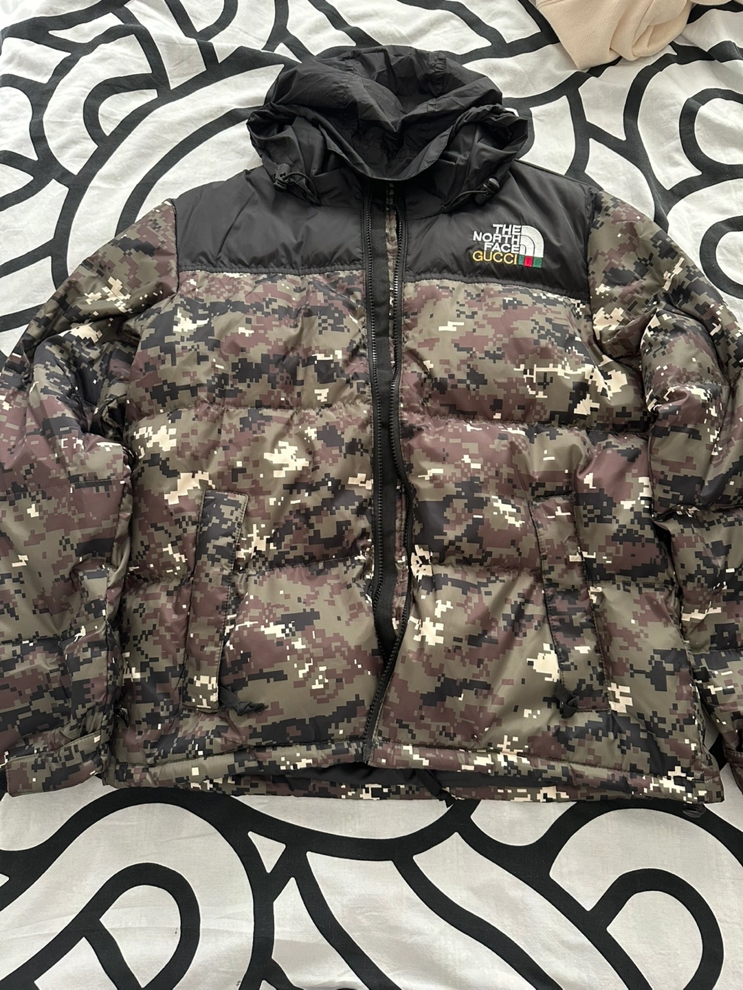 30Men's puffer jacket. Camo print. Features YKK zippers. North Face x Gucci collaboration. Excellent condition.