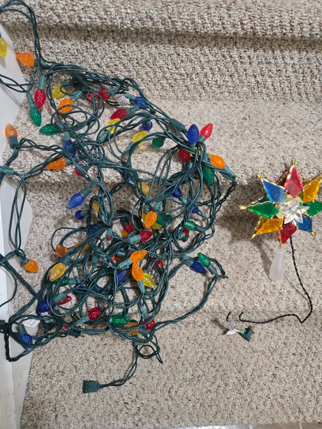 Gifing# a set of vintage style Christmas lights with a colourful star tree topper. The lights are multi-coloured and in good condition and work well when you plug it in. Perfect for adding a retro touch to your holiday decorations!