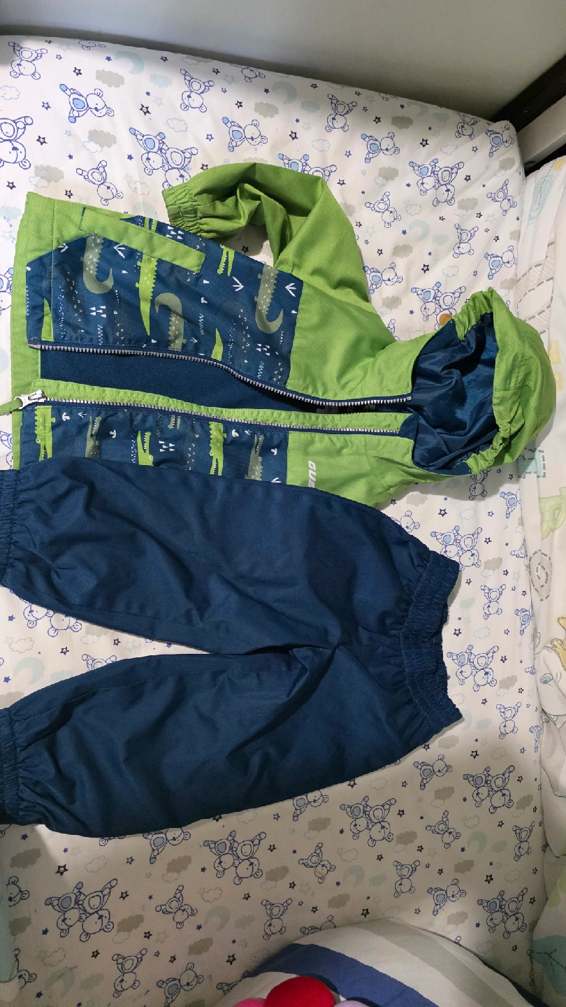 15Keep your little one dry and stylish with this adorable Guepard rain jacket and pants set! The jacket is a vibrant green with a fun crocodile pattern, and the pants are a classic navy blue. Perfect for puddle-jumping adventures!