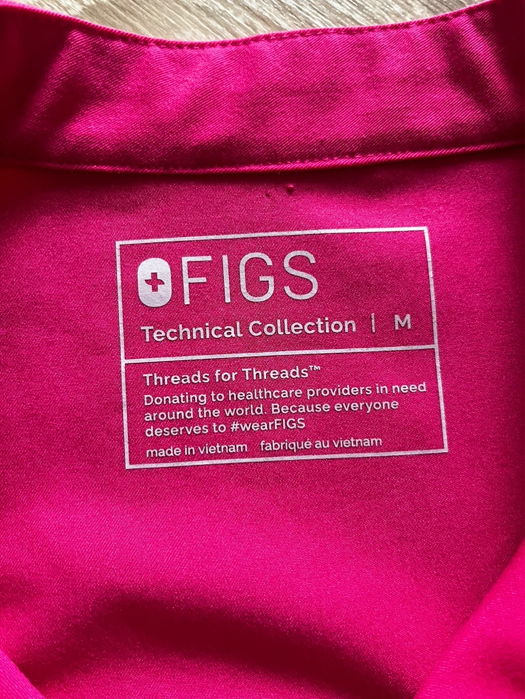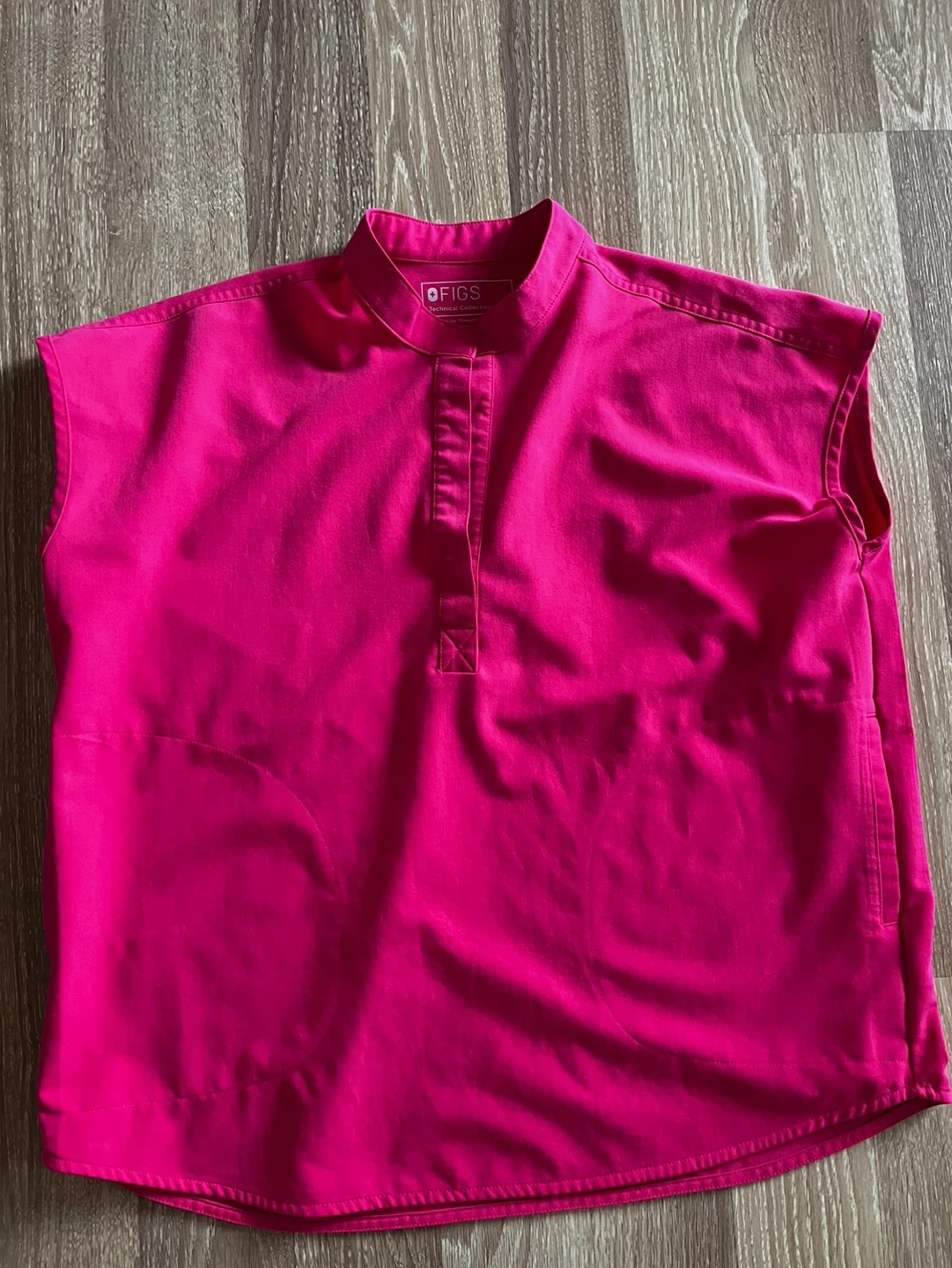 This is a pink FIGS Technical Collection Rafaela (loose fit) scrub top in size medium and fits L. It's made from a durable material for long-lasting wear. This top is designed for healthcare professionals who need comfortable and functional workwear.