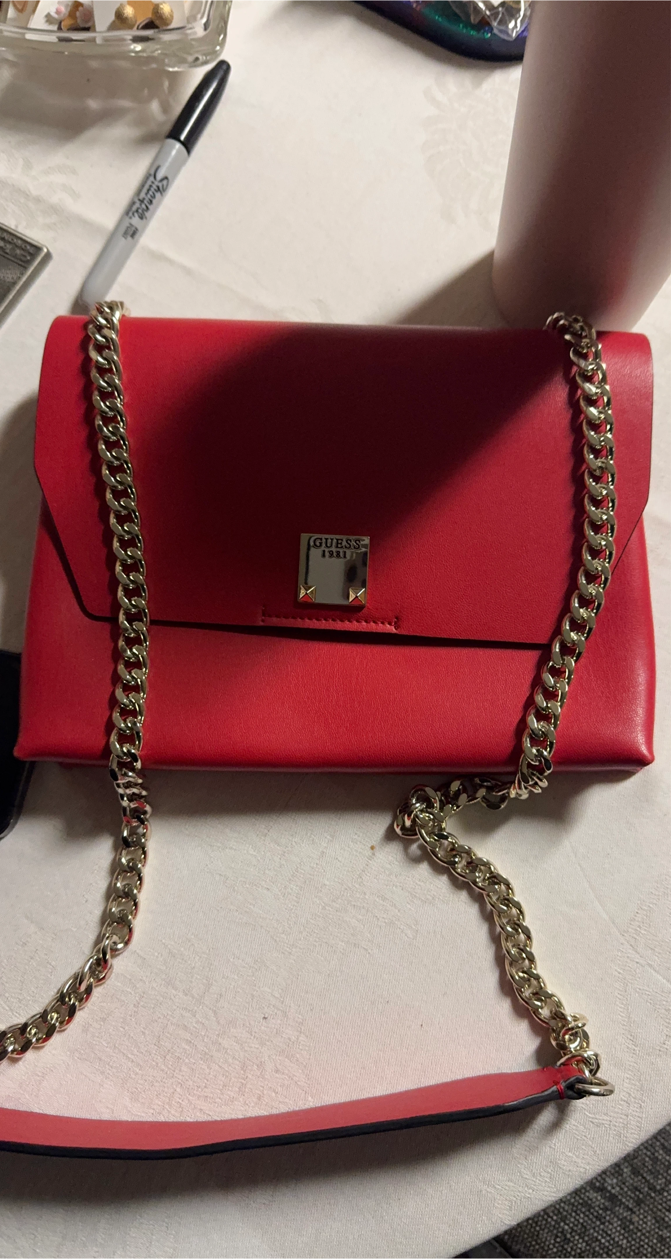 28Selling a vibrant red Guess 1981 shoulder bag! It's in great condition and features a stylish chain strap. Perfect for adding a pop of colour to any outfit. The bag has a sleek design and is made from high-quality materials.