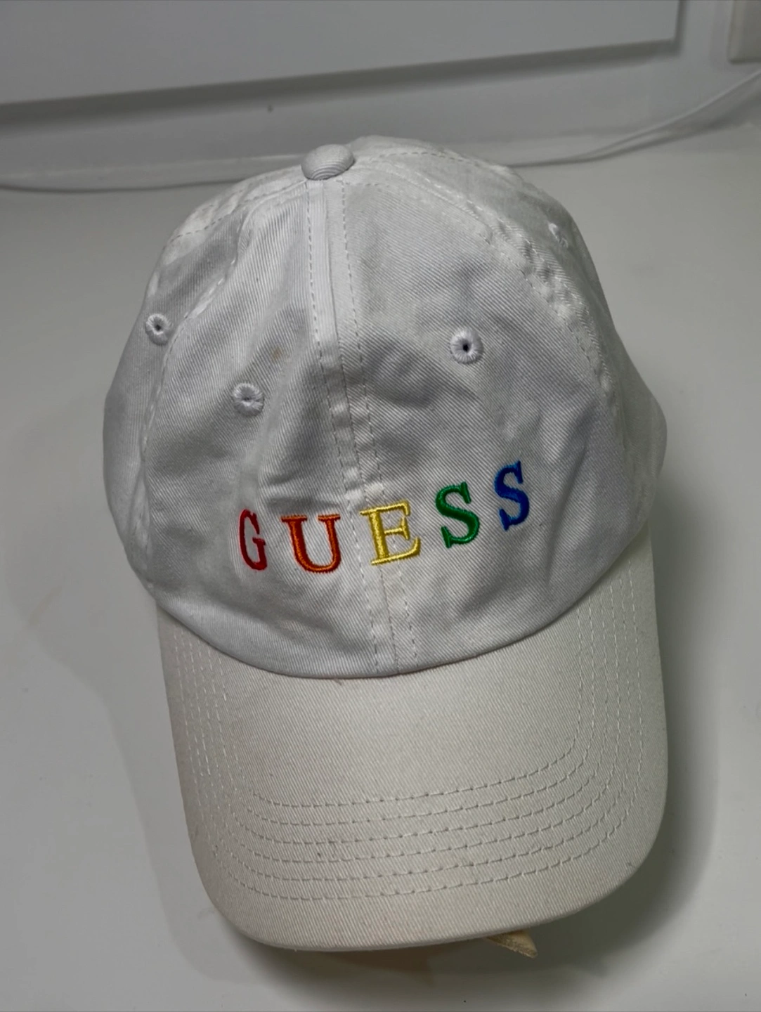267A white baseball cap with the GUESS logo embroidered in rainbow colours. The cap has a curved brim. It is a great accessory for sunny days.