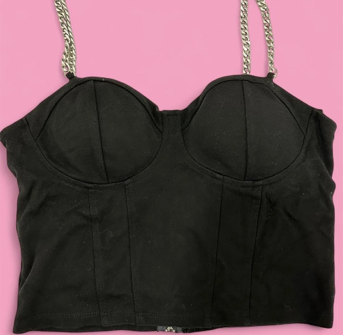 Selling a stylish Guess corset top in black! It features unique chain straps and a flattering fit. The size is M.