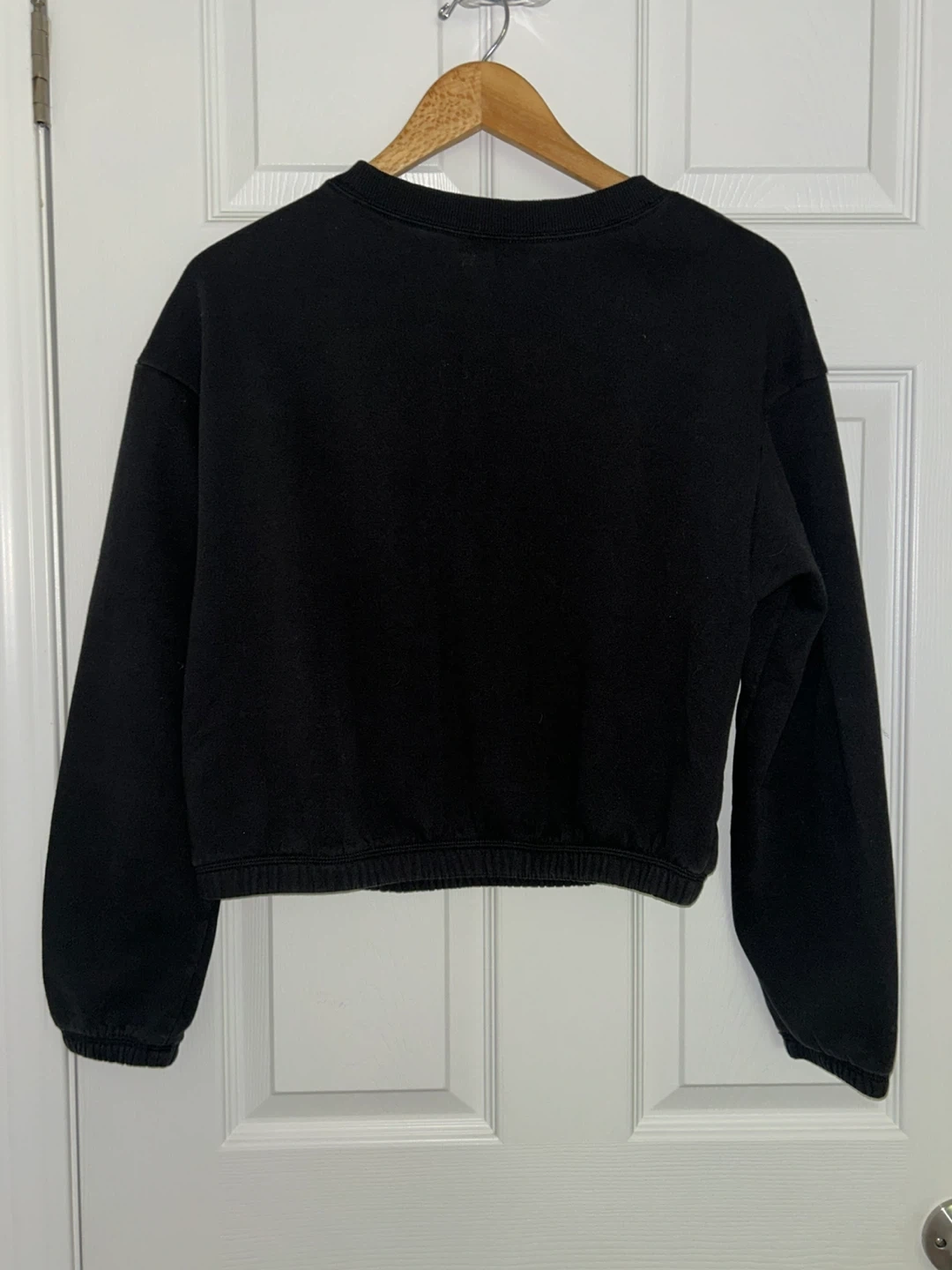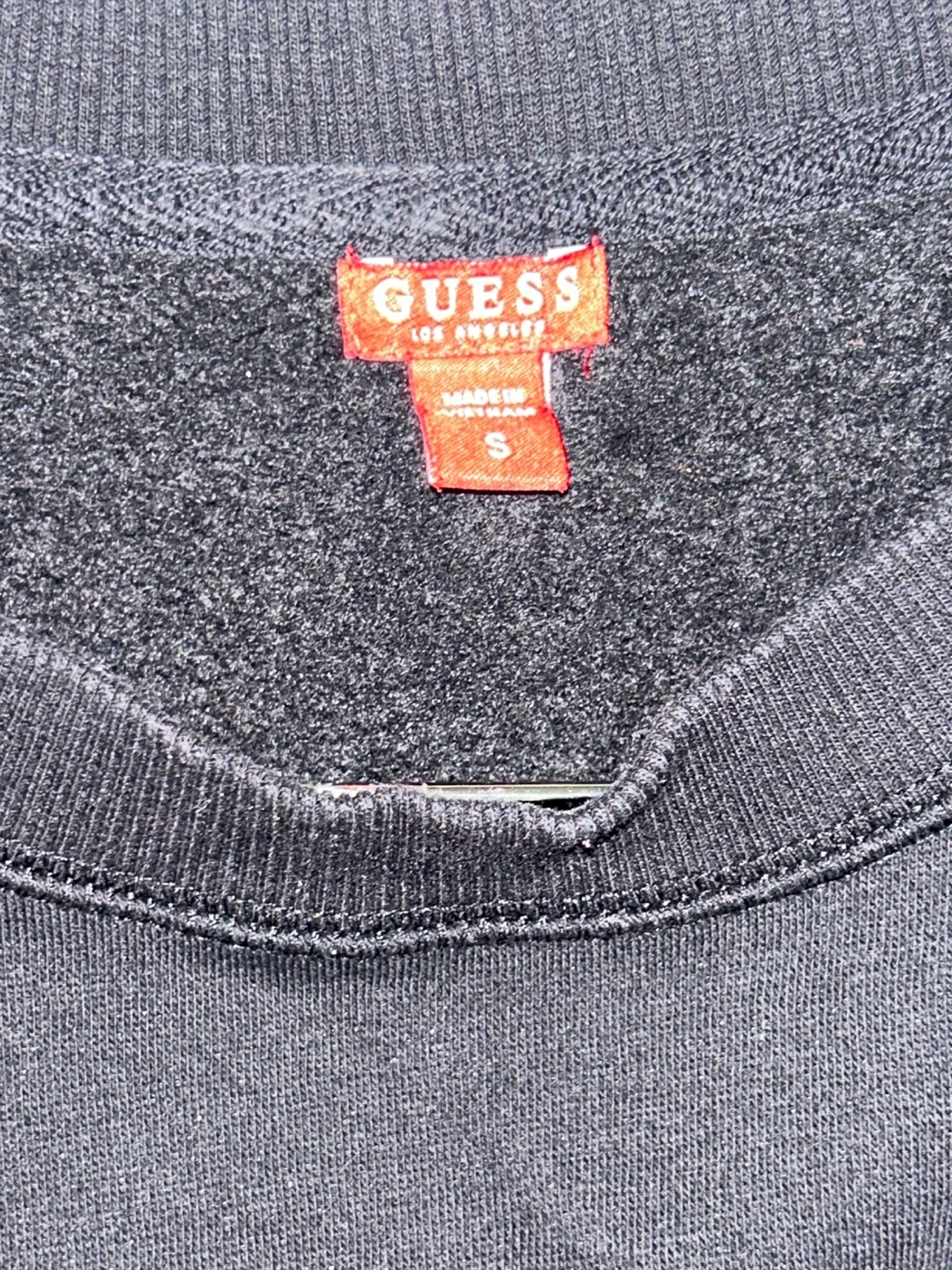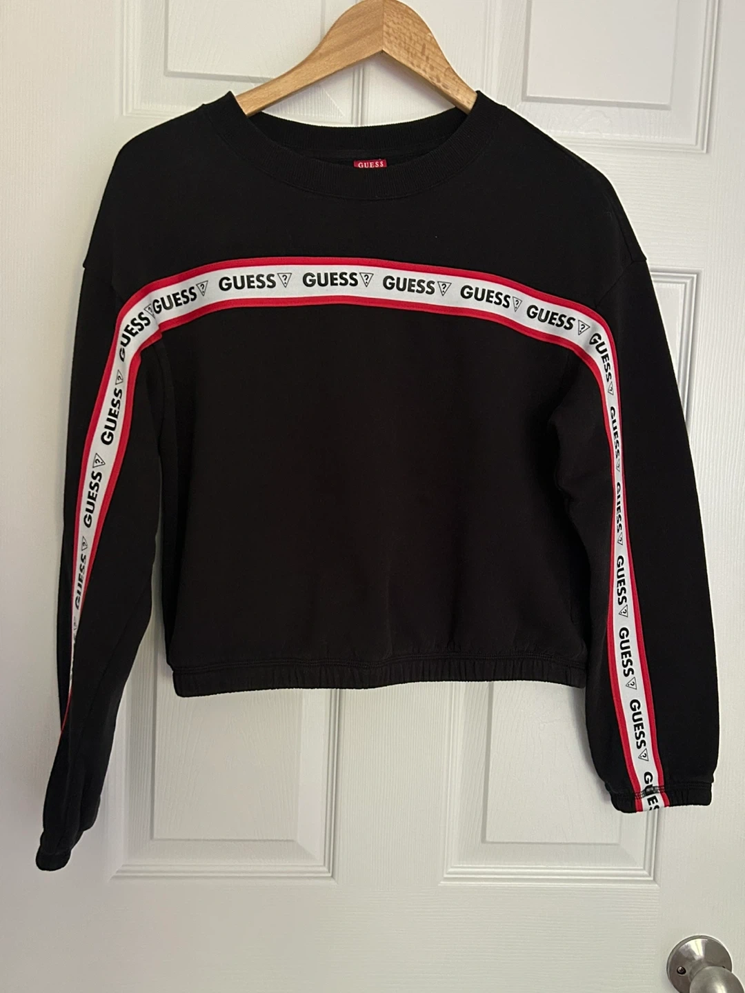 75Selling a Guess cropped crewneck in black, size small. It has the Guess logo repeated along the sleeves and across the chest. Great for casual wear!