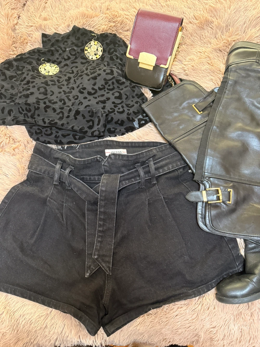 Selling a pair of Guess black denim shorts size 29. They feature a belted waist and are in good condition. Perfect for a casual look!