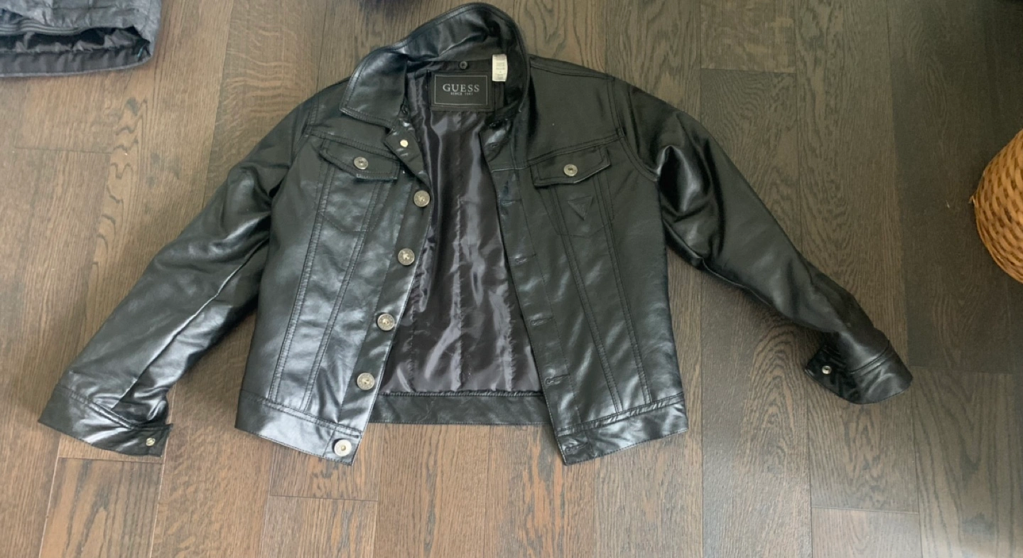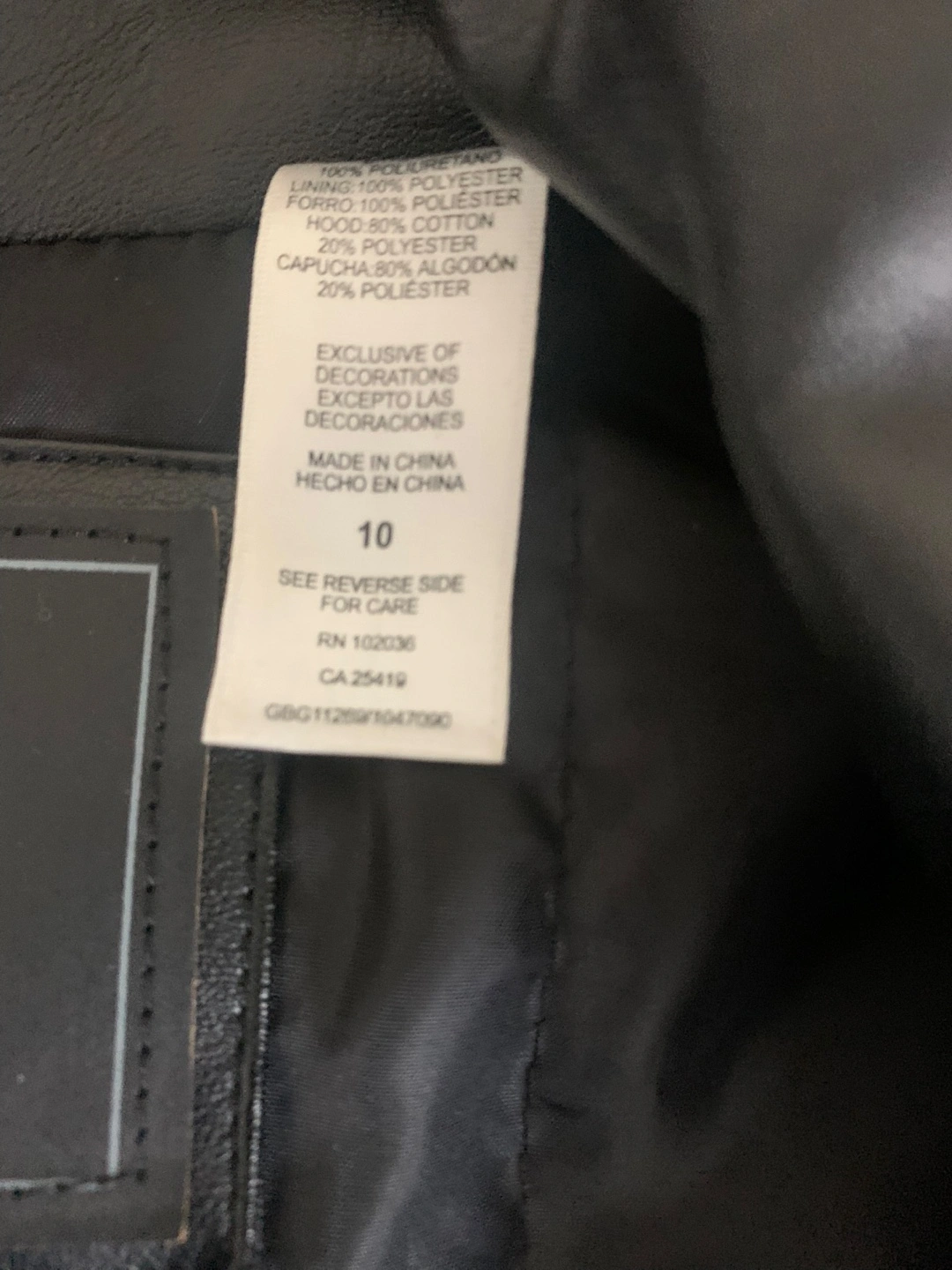 149Selling a Guess black faux leather jacket in size Youth 10. It's in great condition and ready for a new home! The lining is 100% polyester and the hood is 80% cotton, 20% polyester