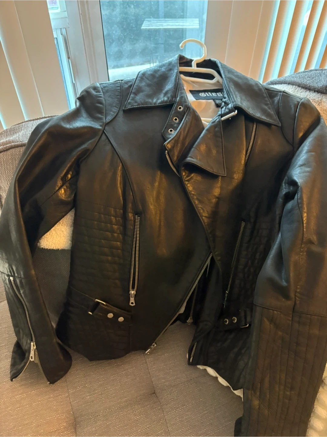 15Selling a stylish Guess black leather jacket! It's in great condition and features a classic design with zippers and quilted detailing on the sleeves. Perfect for adding a bit of edge to any outfit!