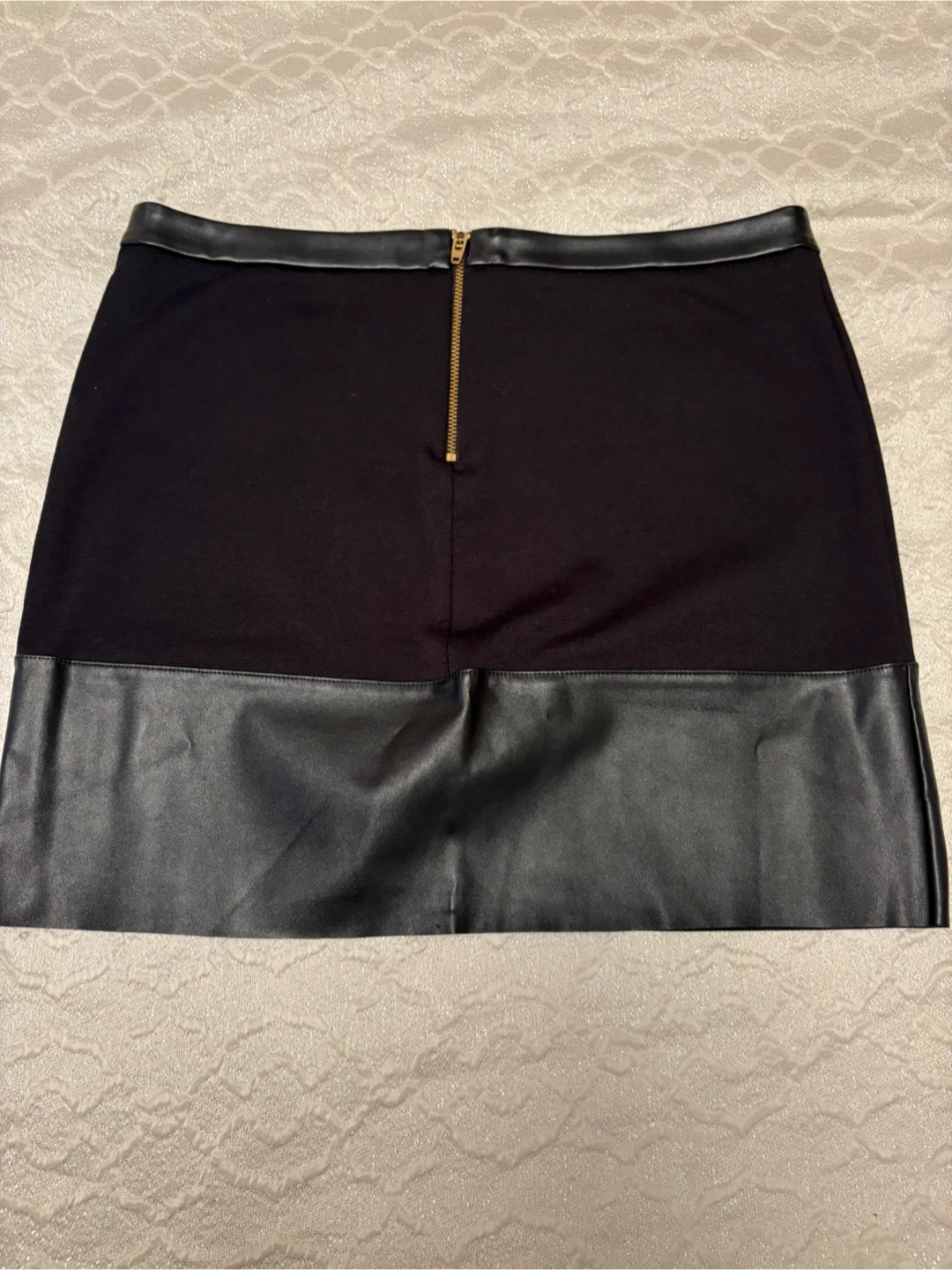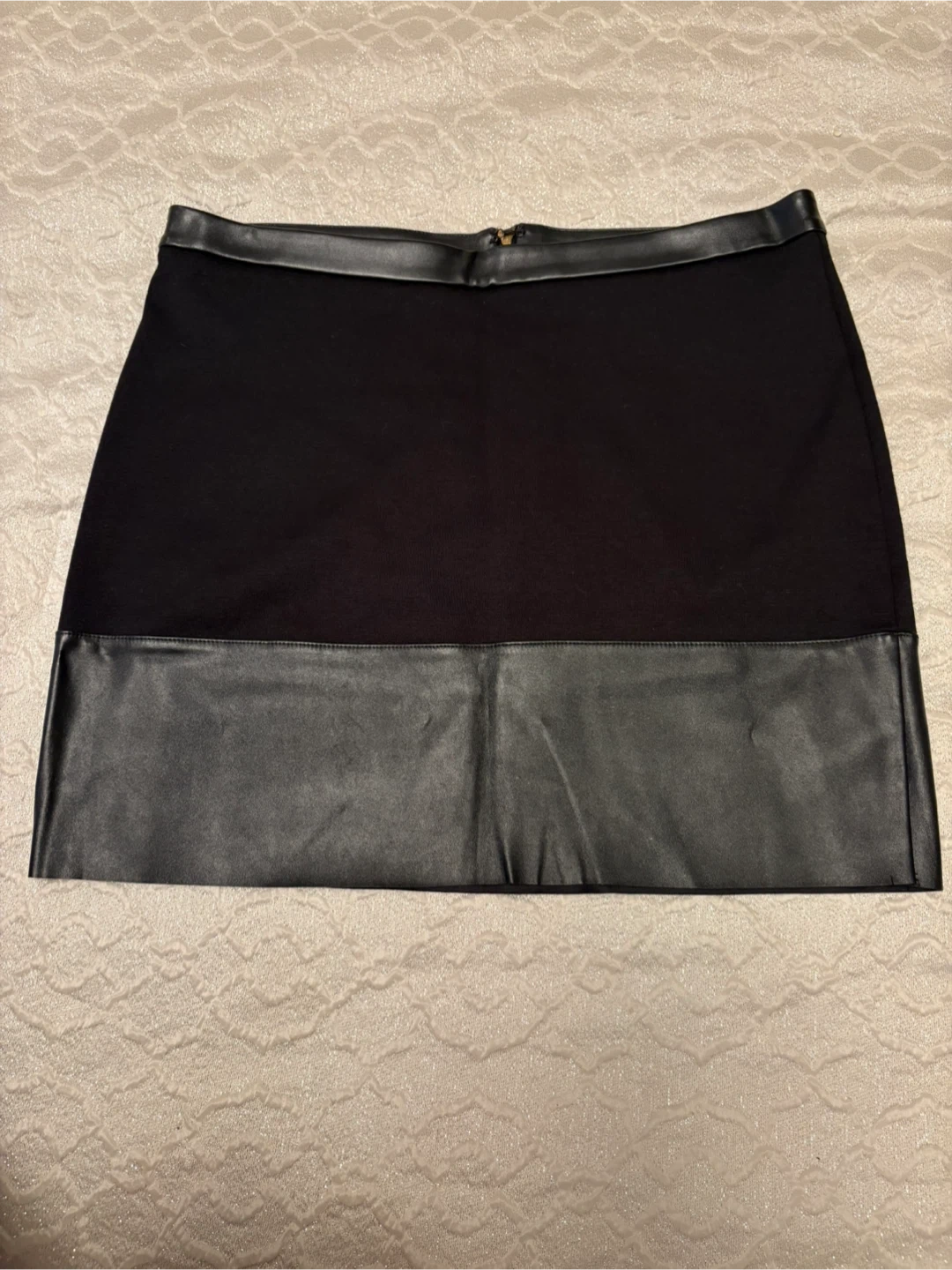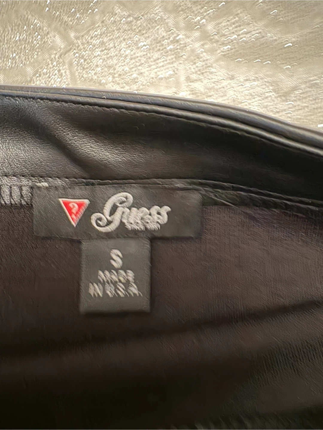 23Selling a cute Guess mini skirt in black. It features a faux leather trim and a gold zipper in the back. Size is small.
