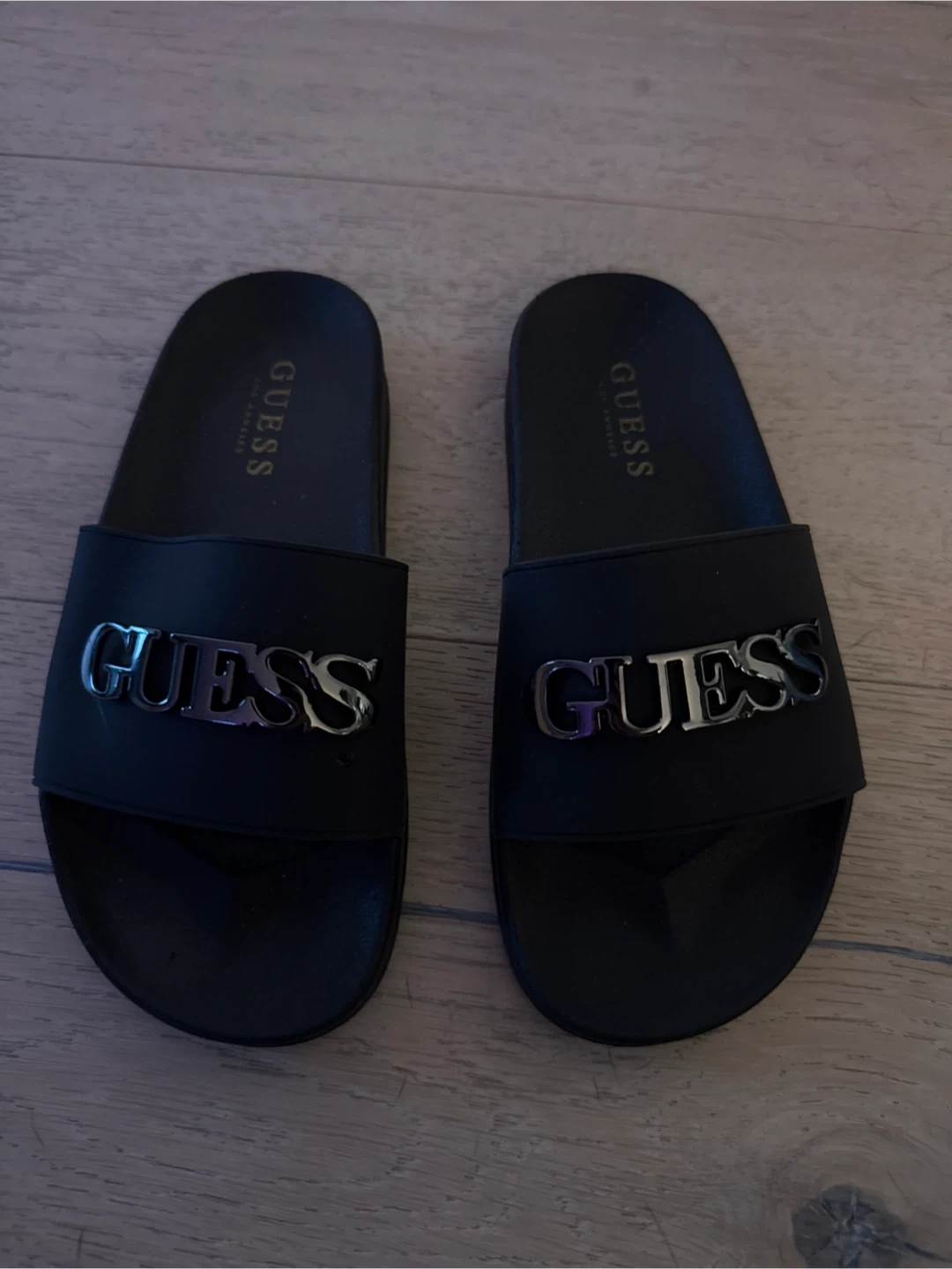 18Selling a pair of Guess slides in black. They have the Guess logo on the strap. Perfect for summer!size 5 women’s