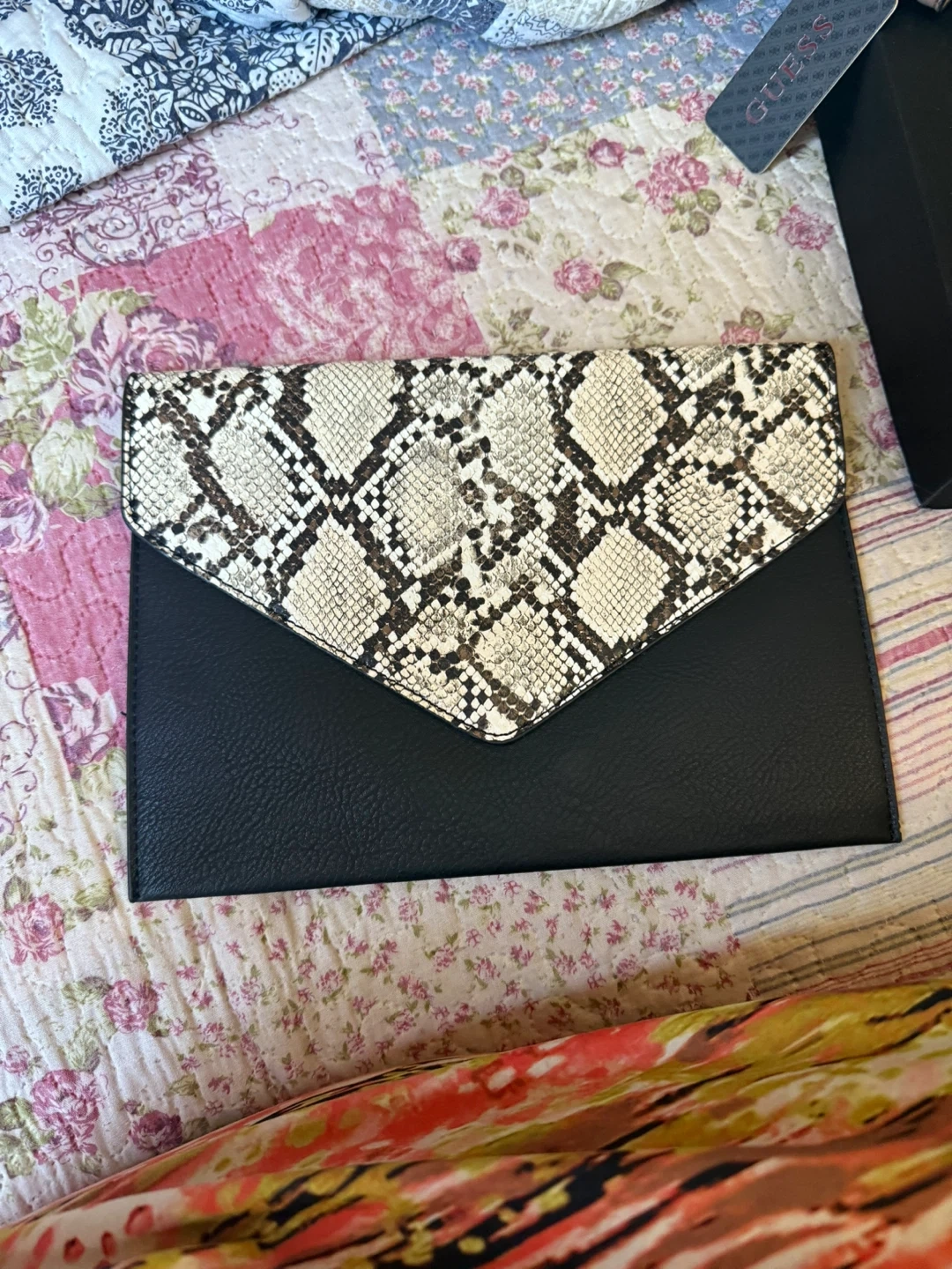 10Selling a stylish Guess clutch! It features a black base with a snakeskin-patterned flap. Perfect for a night out or adding a chic touch to your outfit