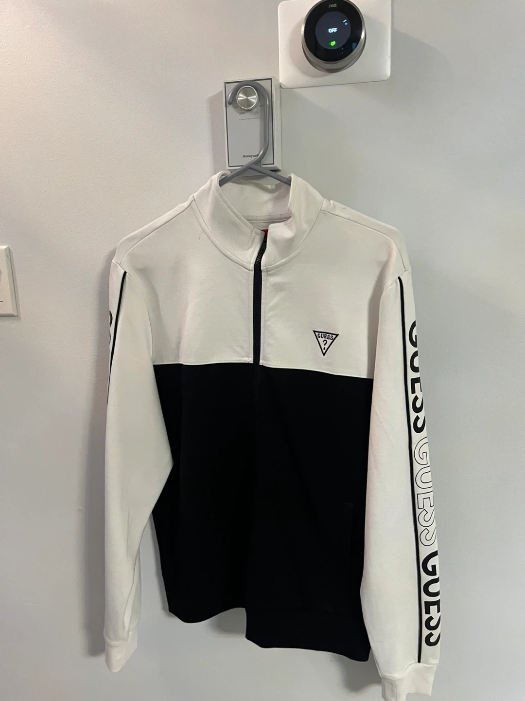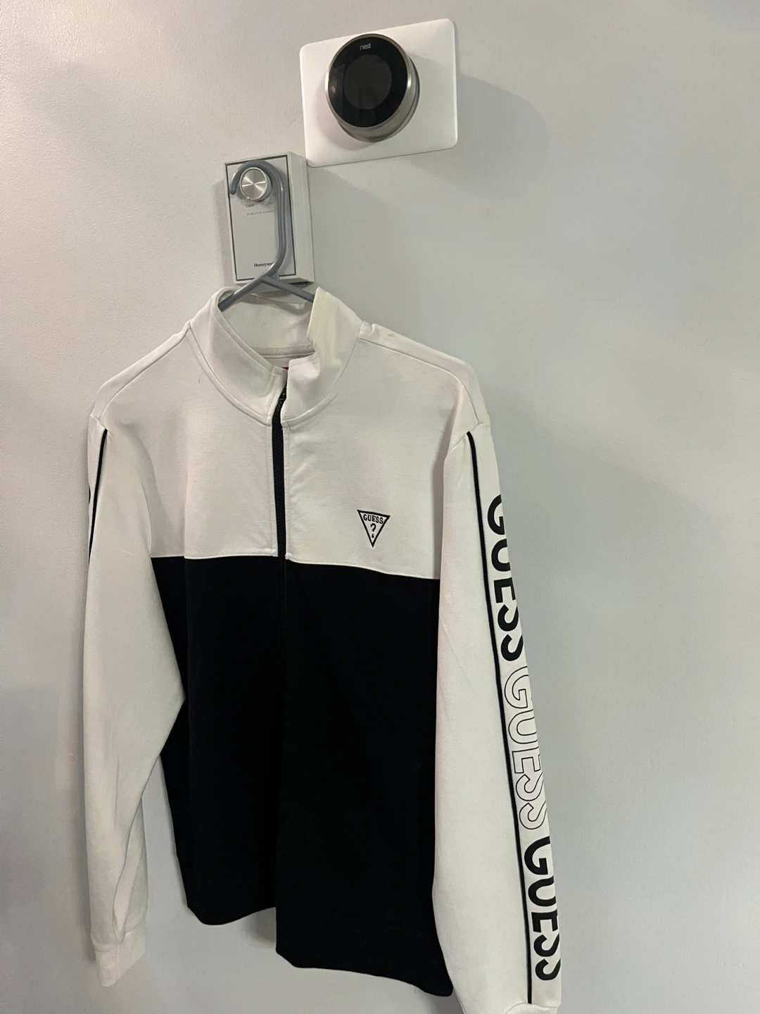 37Selling a Guess track jacket in a stylish black and white colour block design. The Guess logo is featured on the chest and down the sleeve. It's new