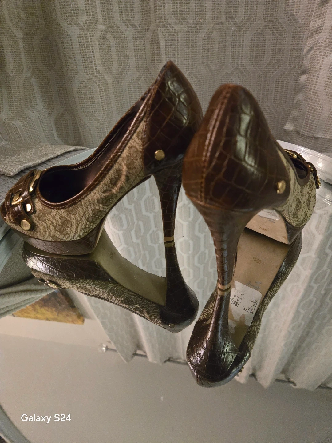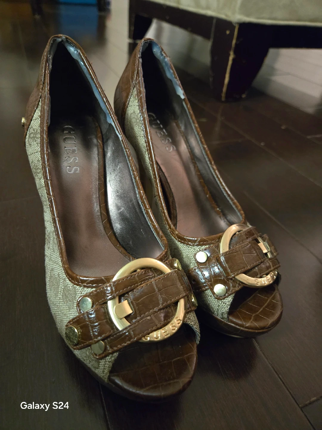 10These are a pair of brown Guess heels in size 5.5. They have a unique design with a peep toe and a buckle detail and 4 inch heel. Perfect for dressing up any outfit! Selling as is, final sale.