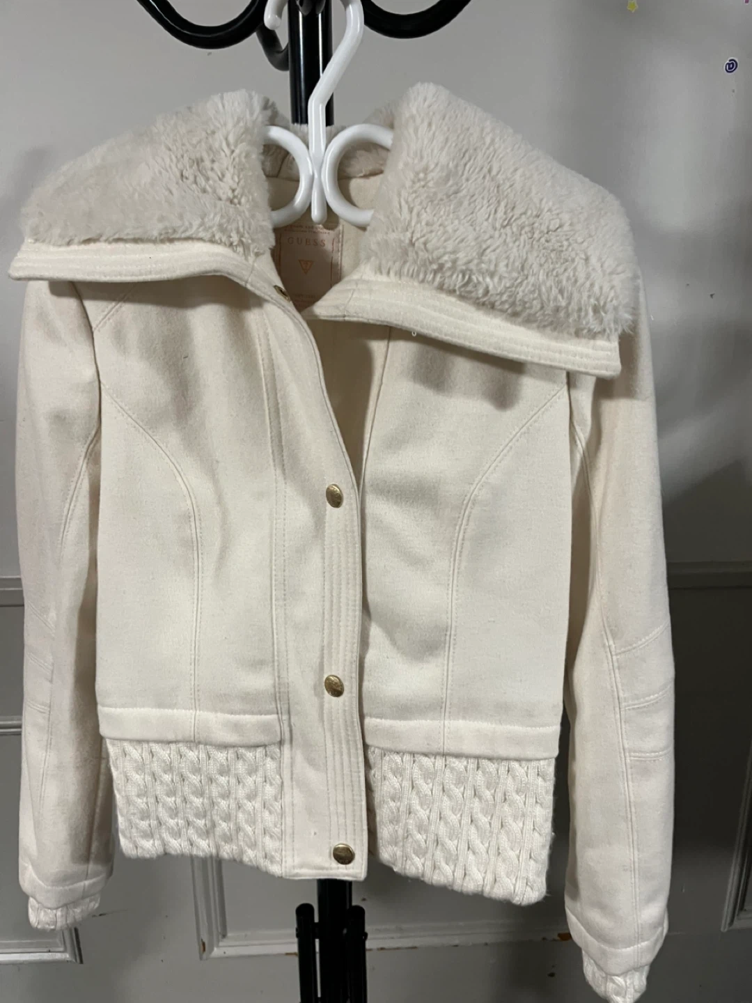 60I'm selling a cute Guess jacket in cream colour! It features a cozy faux fur collar and gold button details. Perfect for adding a touch of warmth and style to your wardrobe.