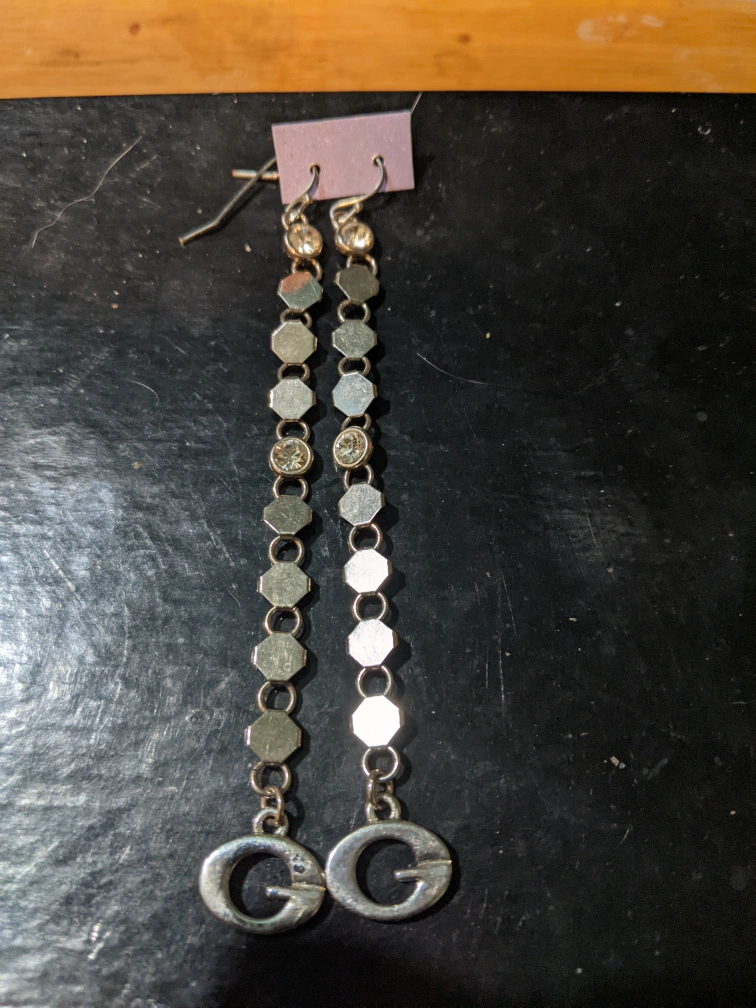 39Selling a pair of Guess dangle earrings. They feature a chain of silver-toned geometric shapes and rhinestones, finished with the classic 'GG' logo at the bottom