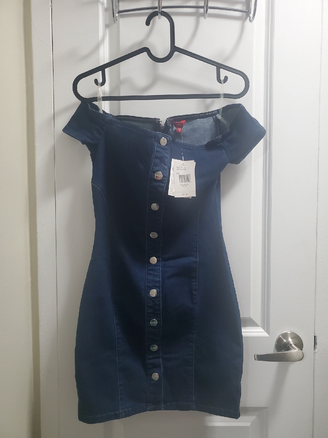 22Guess off-the-shoulder dress in size XS/TP. The dress is a dark wash denim colour and features a zipper closure in the back and button details in the front. Originally bought for $54.99! Brand new. Smoke-free, pet-free Pick up only near Port Credit Go station in Mississauga