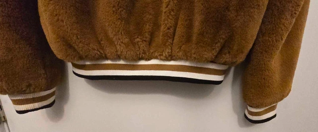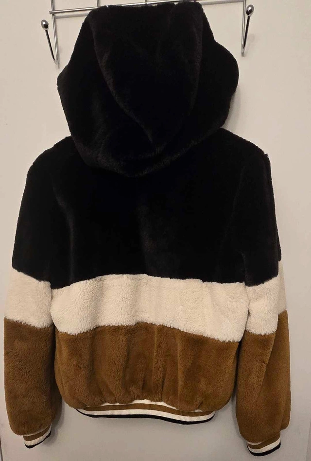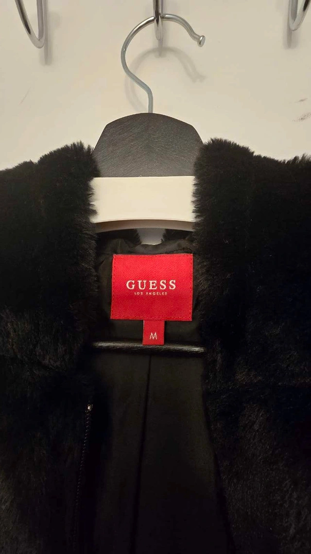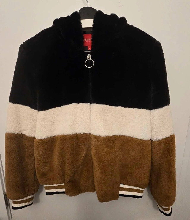 Guess faux-fur jacket with a color-block design in black, white, and brown. Winter Jacket 100% Polyester Dry Clean only Made in China Size: Medium (US, CA, MX) EU 38 UK 8 Condition: Used - Good Size: Medium (8-10) Cash accepted: Yes Cashless payment: Yes For Sale By: Owner