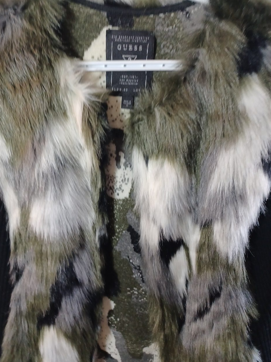 75Selling a gently used Guess faux fur vest in size medium. It features a camouflage pattern on the lining and black ribbed sides. Perfect for adding a stylish touch to your outfit!