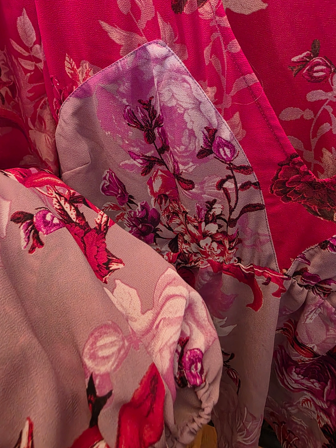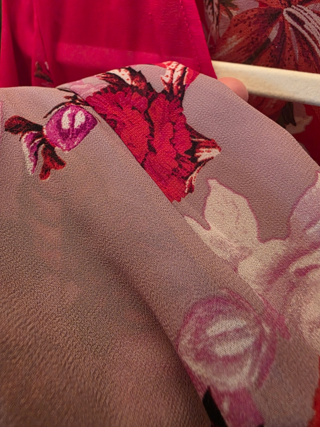 63Women's long-sleeved blouse. Size XL. Red and purple floral print. V-neck.
