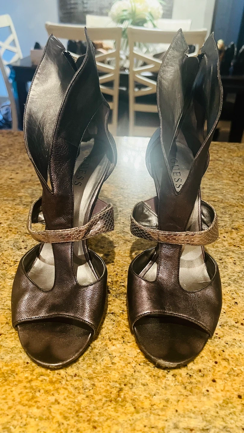 5Selling a pair of very unique Guess heels in size 10. They feature a unique design that flairs at the ankles with a back zipper and a metallic silver strap. The heel height is approximately 3 inches. They are in good condition and would be a stylish addition to any wardrobe!