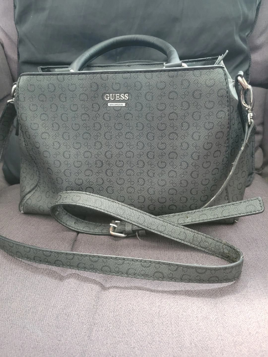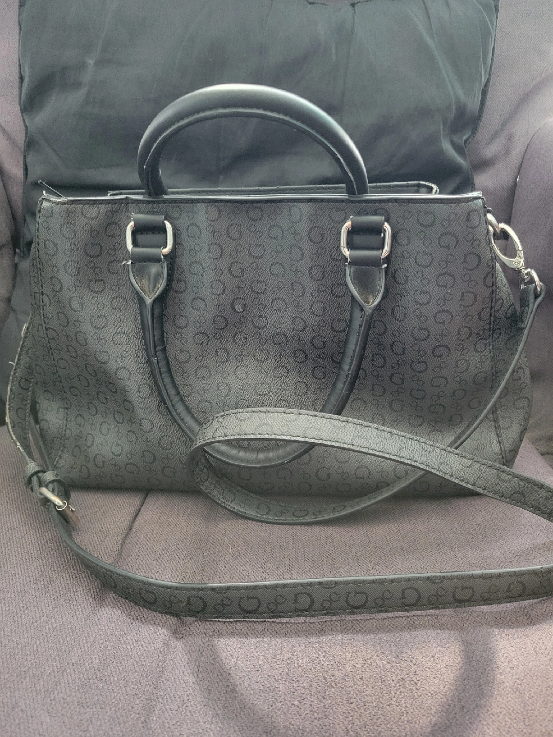 Classic style and all year colour tone are all over this Guess, black satchel bag! It's in good condition and features a stylish design with the Guess logo pattern. Inside features 3 larger pockets and smaller sections along the outer walls. Great for organizing! Removeable shoulder strap included . Perfect for everyday use!