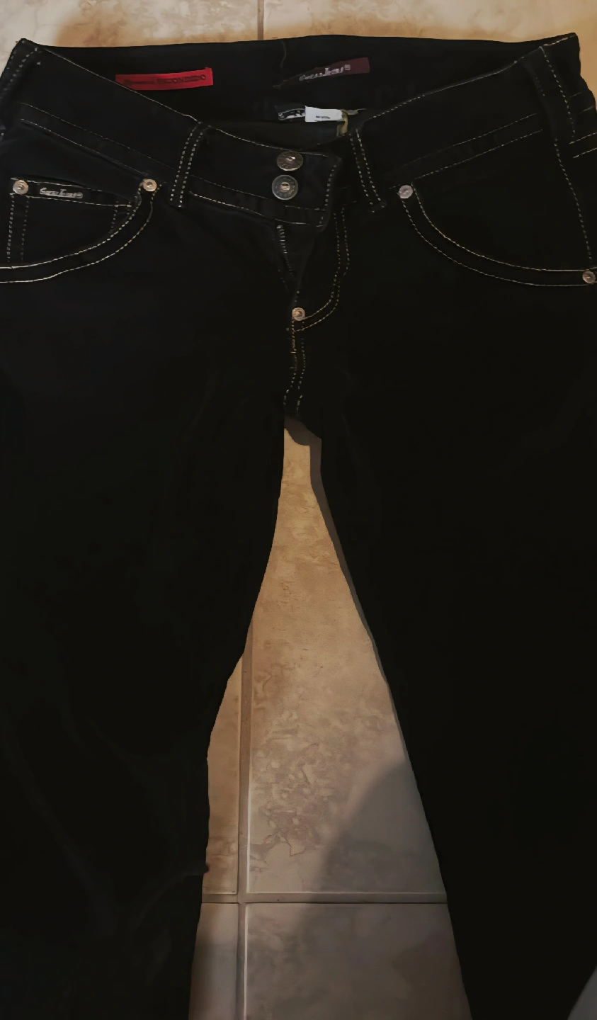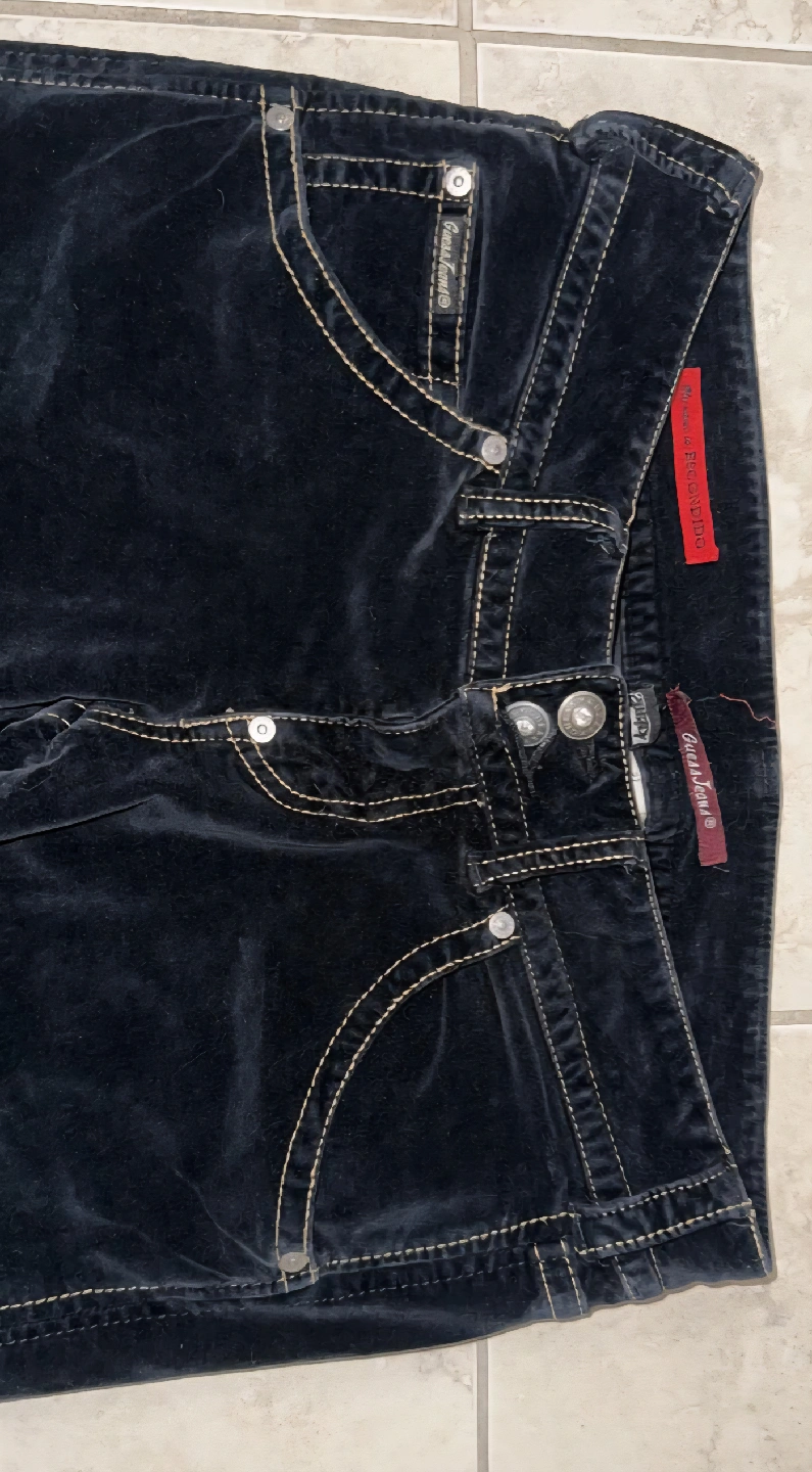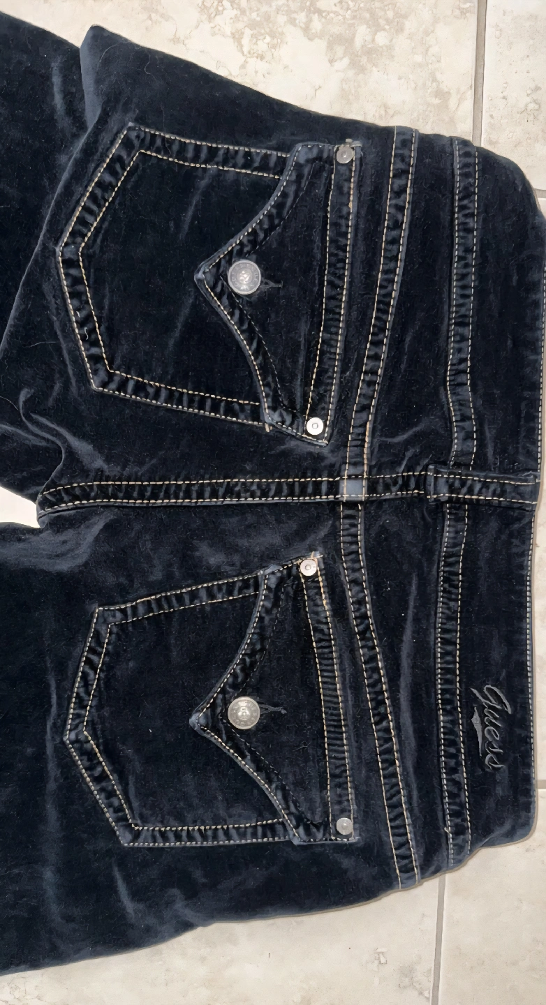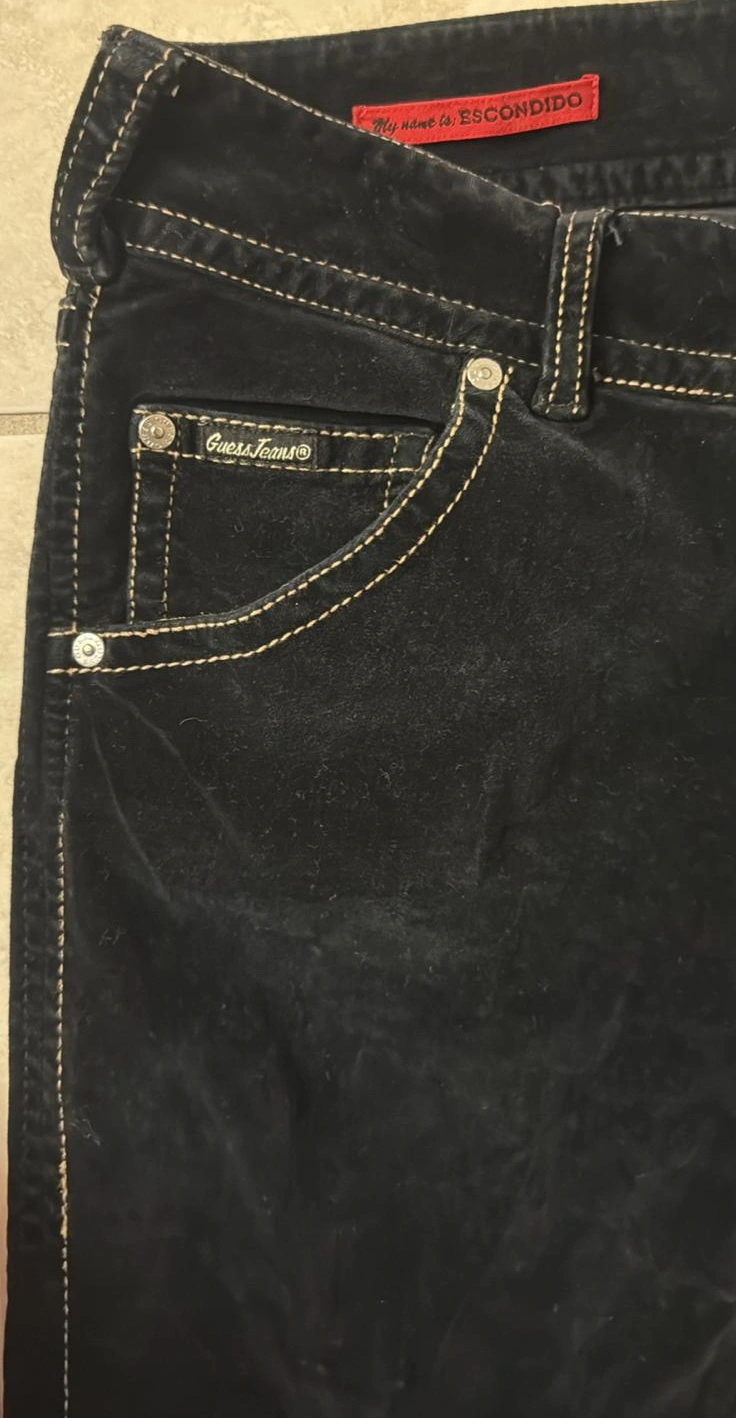 10Selling a pair of Guess Jeans in black velvet. They feature a unique pocket design and are in great condition. Perfect for adding a touch of elegance to your wardrobe!