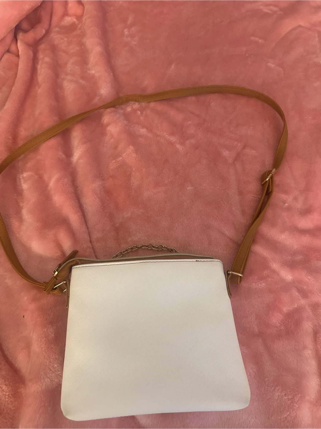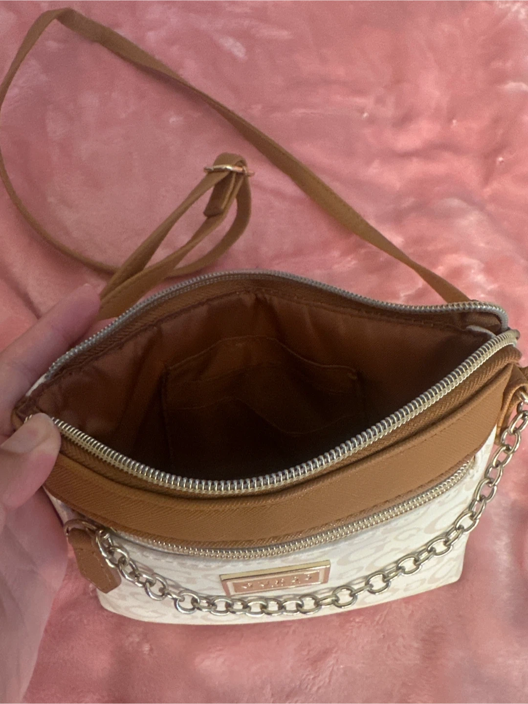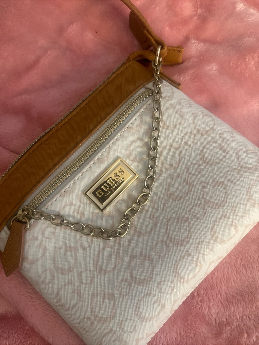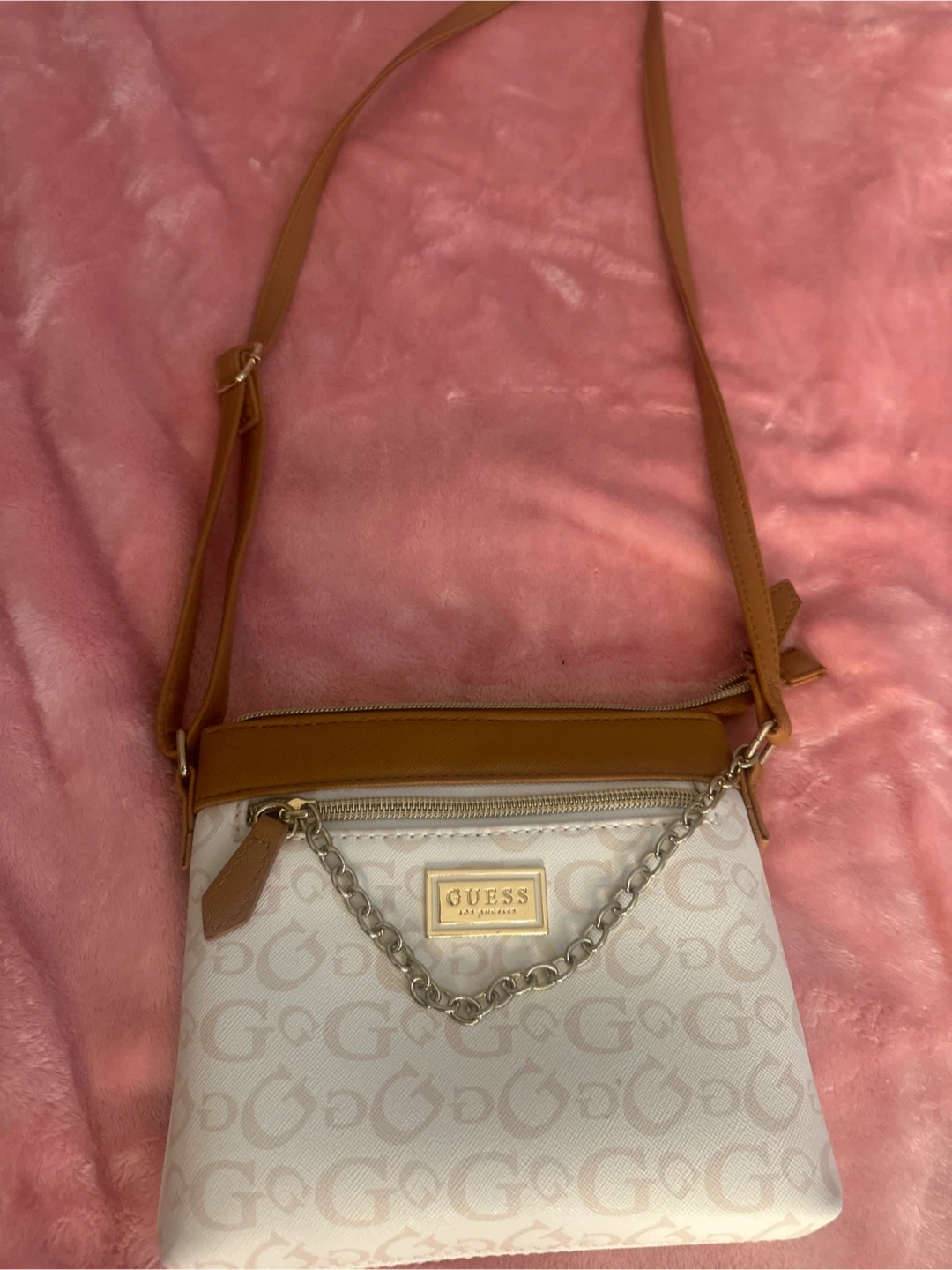 10Guess Los Angeles crossbody bag, perfect for everyday use. It has a stylish design with the Guess logo pattern and a chain detail. The bag features a zip closure and an adjustable shoulder strap. Only worn a few times, in great condition as new.