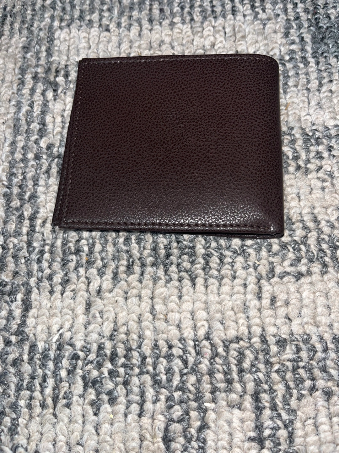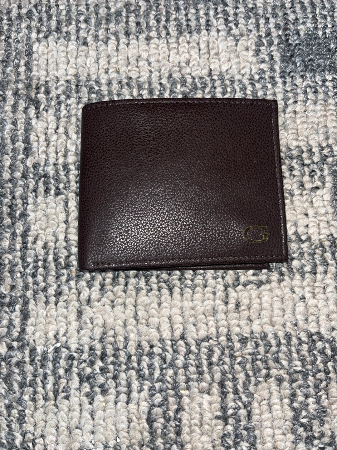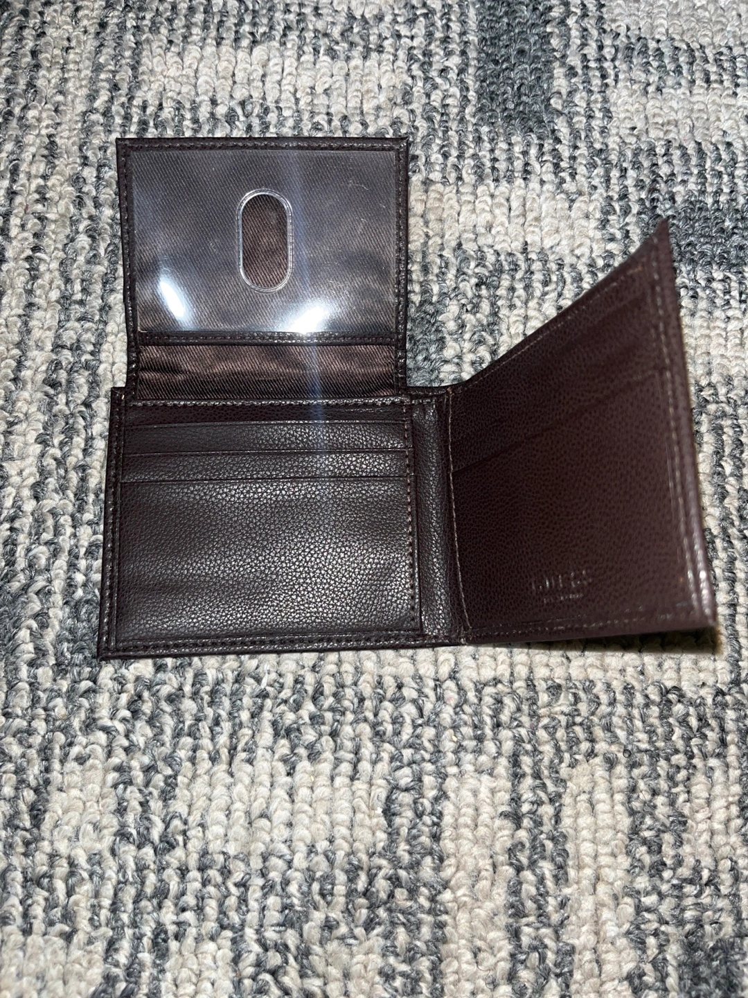 Brown leather bi-fold wallet. Features multiple card slots and ID window. Good condition.