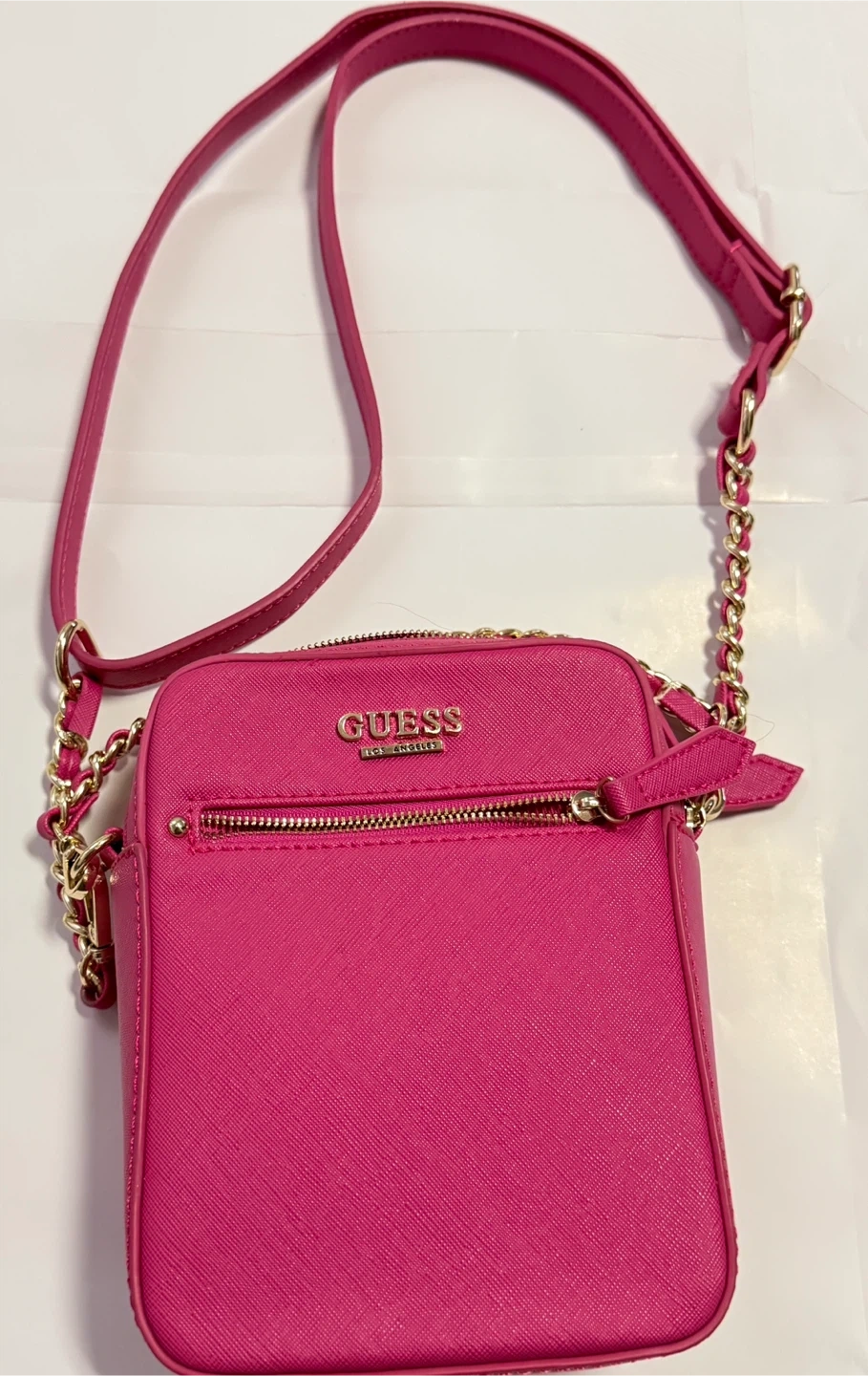 Selling a cute Guess crossbody bag in pink! It's a stylish and compact bag perfect for carrying your essentials. The bag features a zipper closure and a long strap for comfortable wear. It also has gold-tone hardware accents.
