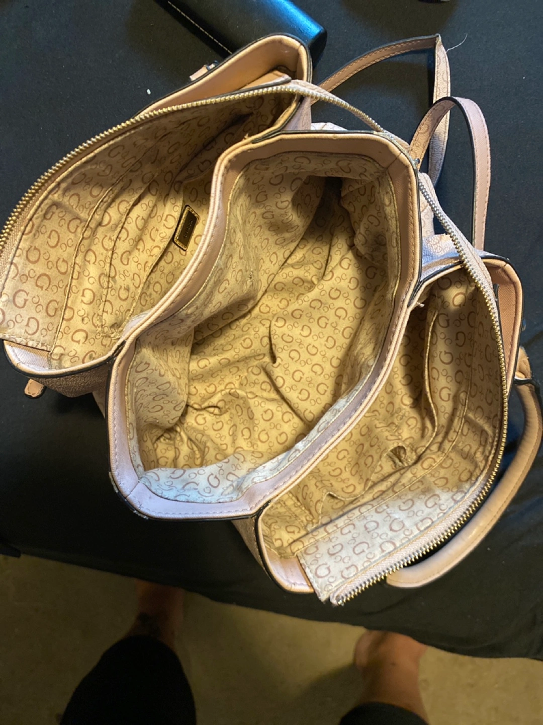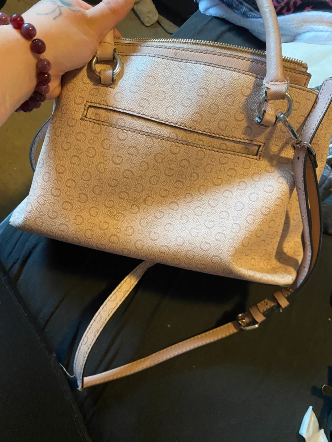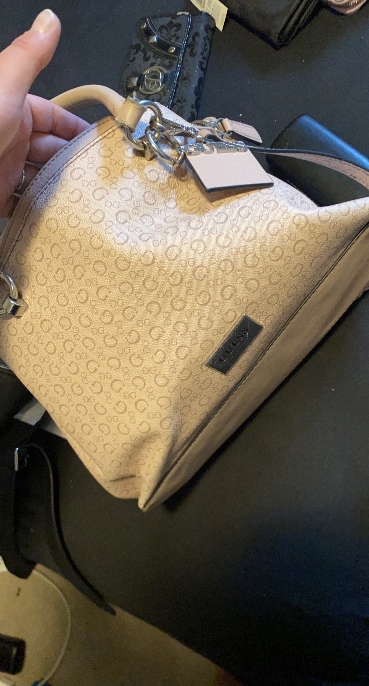 Selling a cute Guess satchel bag! It features a light pink colour with a repeating 'G' pattern. It's got a few compartments inside to keep things organized. Perfect for everyday use!