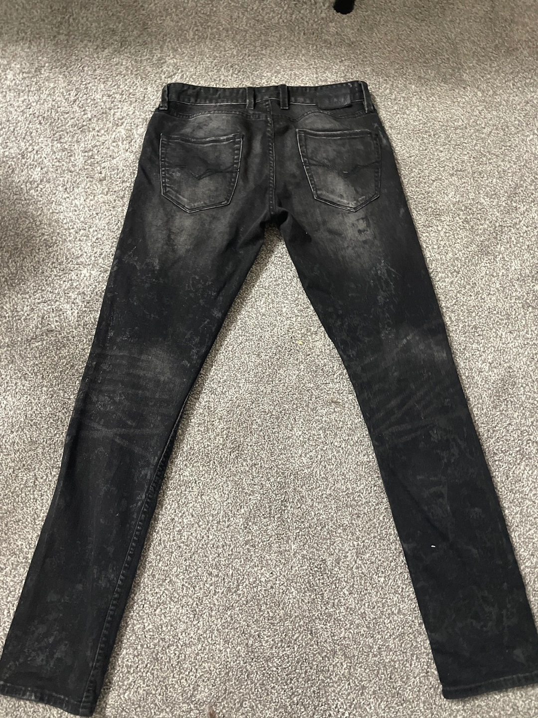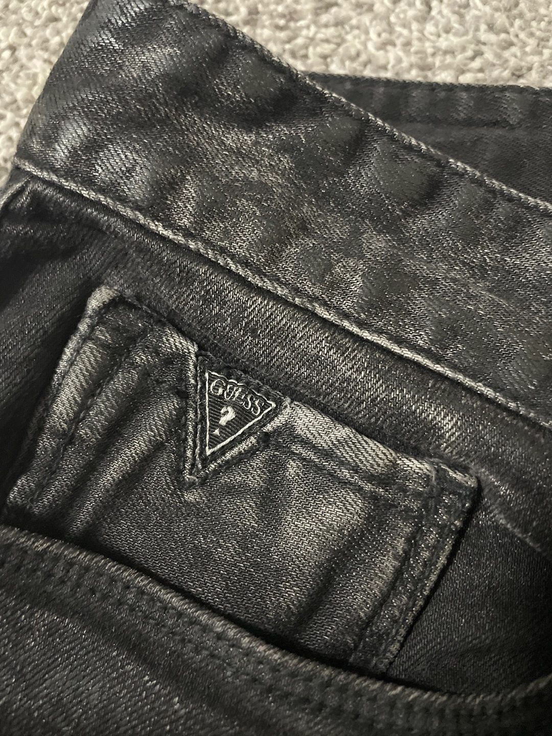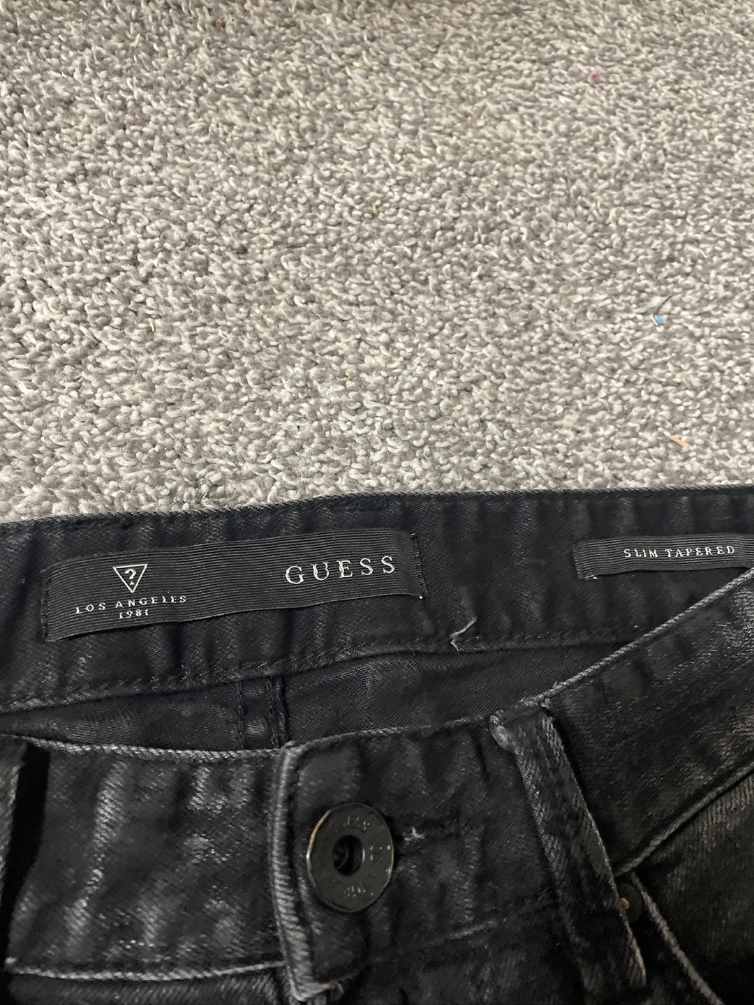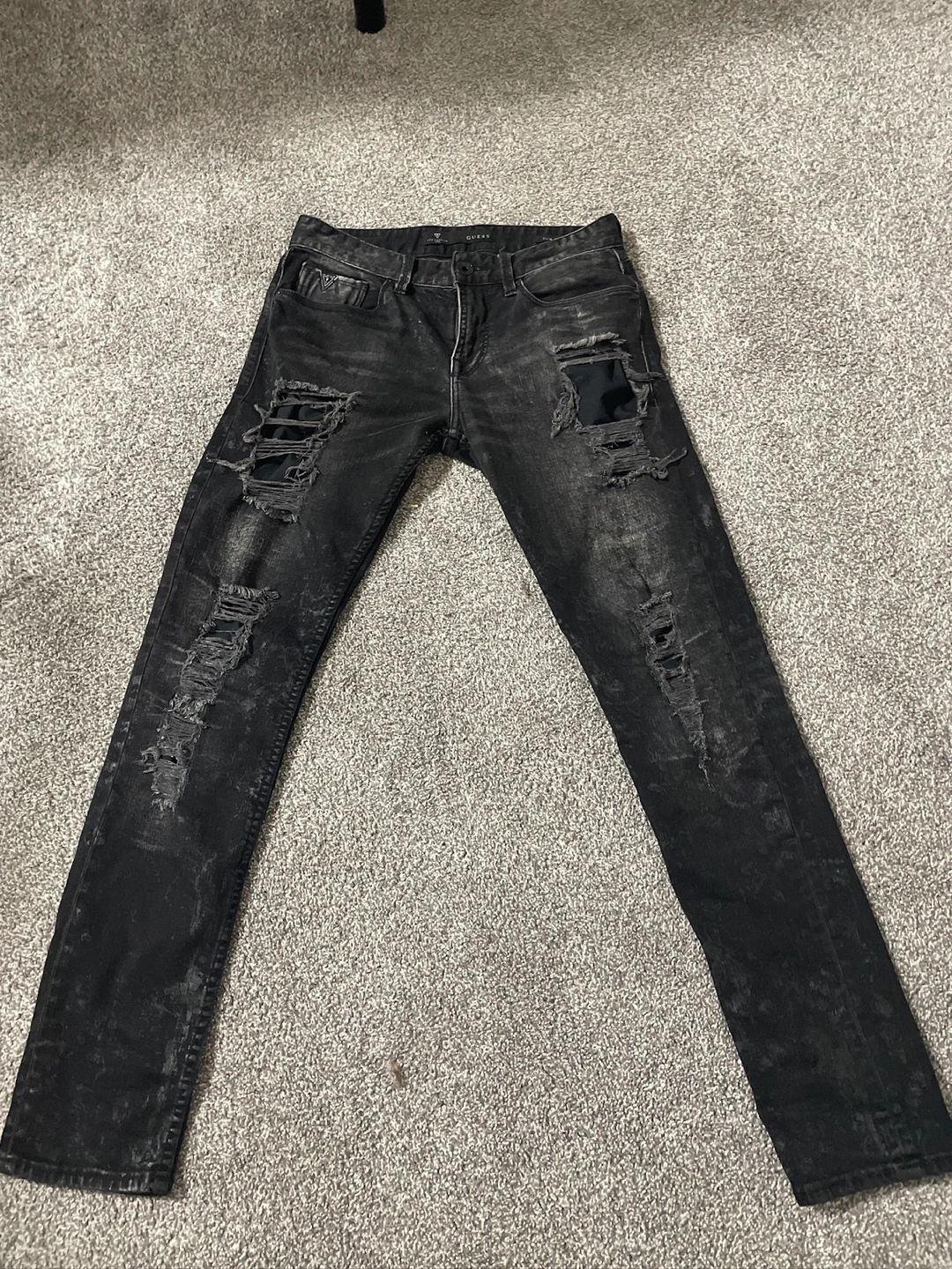 42Selling a pair of Guess slim tapered jeans in black! These jeans feature a distressed design with rips and fading throughout. They are a stylish and edgy addition to any wardrobe