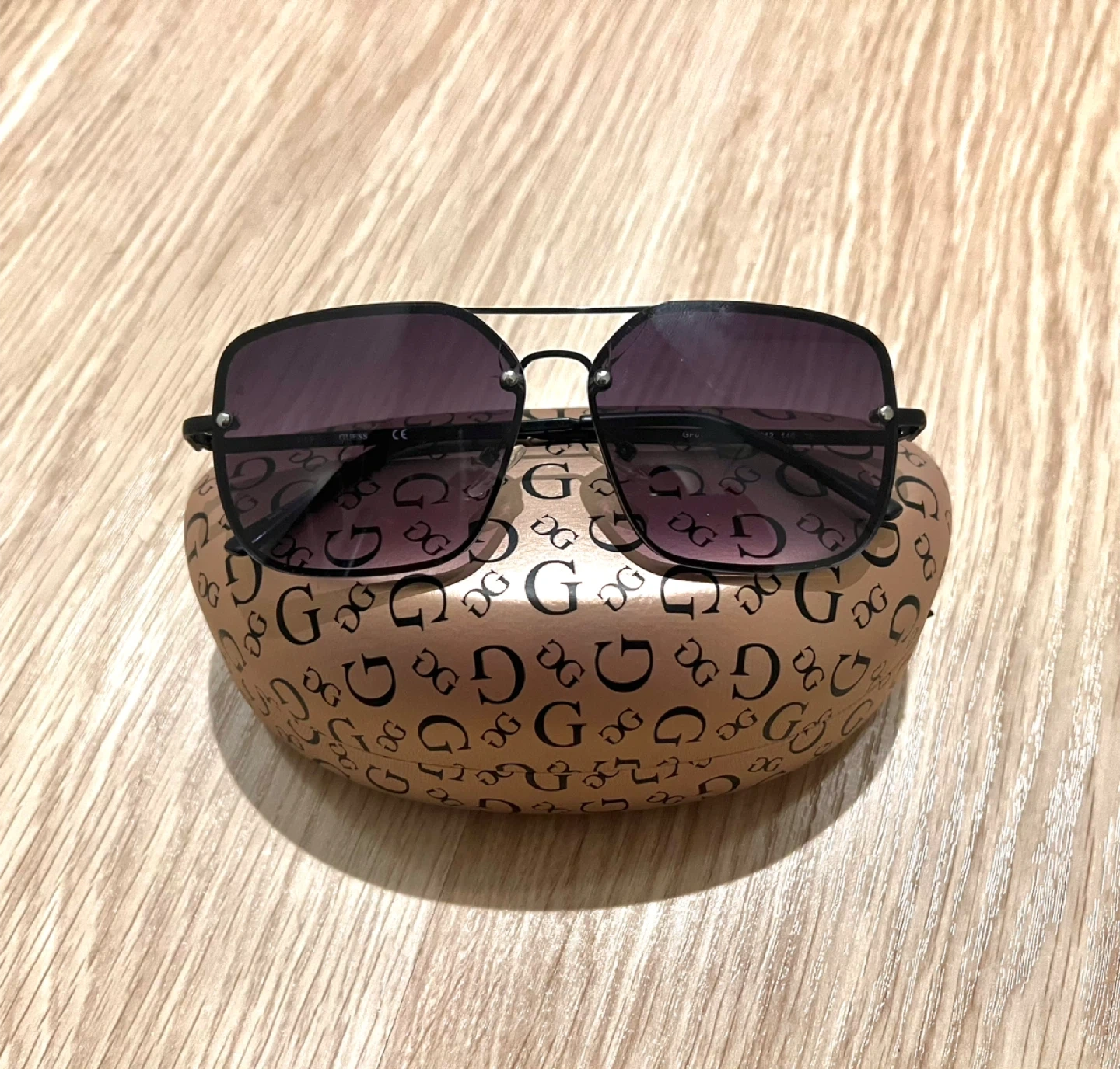 Selling a pair of Guess sunglasses. They come with a Guess branded case for protection. The sunglasses feature a stylish design with a black frame and dark lenses.