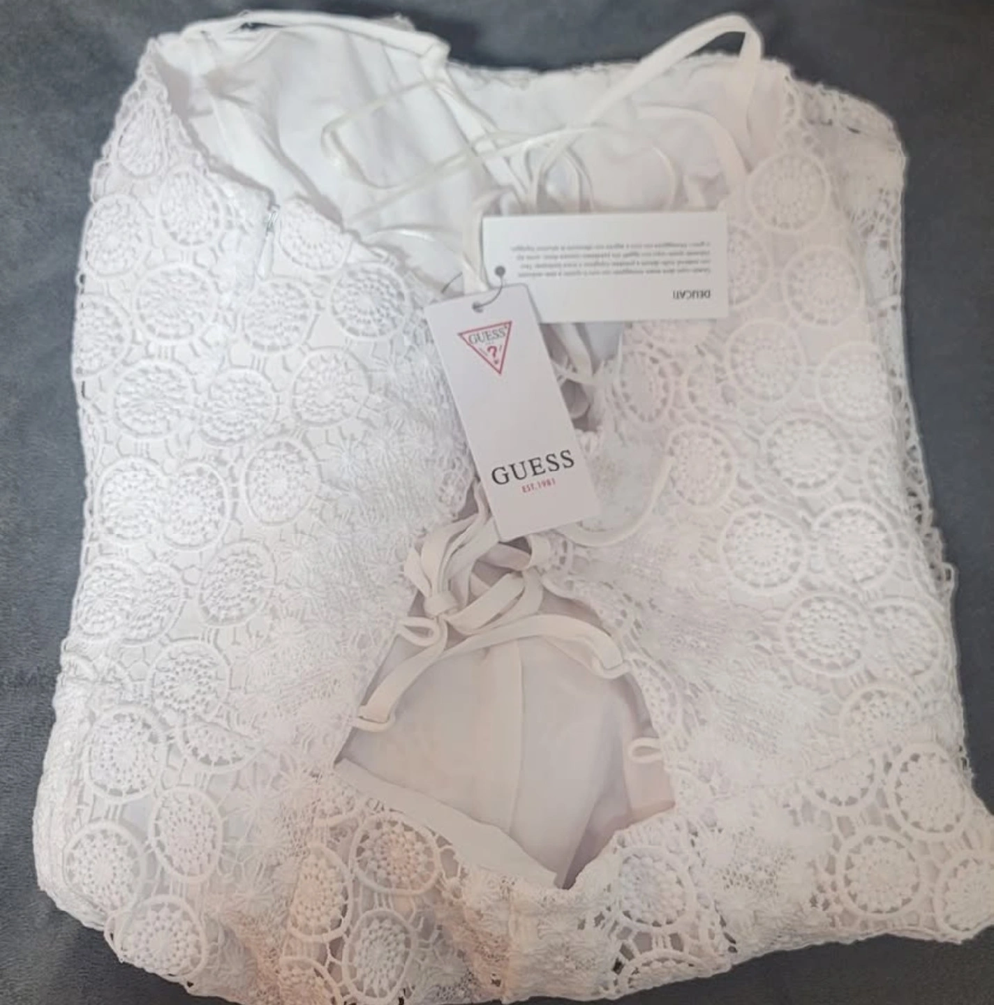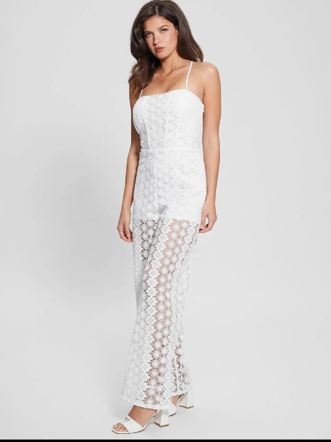 60Selling a beautiful white lace jumpsuit from Guess! It features a delicate lace pattern and a stylish back design. Perfect for a special occasion or a night out. It's in great condition and ready for a new home! Brand new/ Never worn/ Size S/ Comes with all tags including price tag