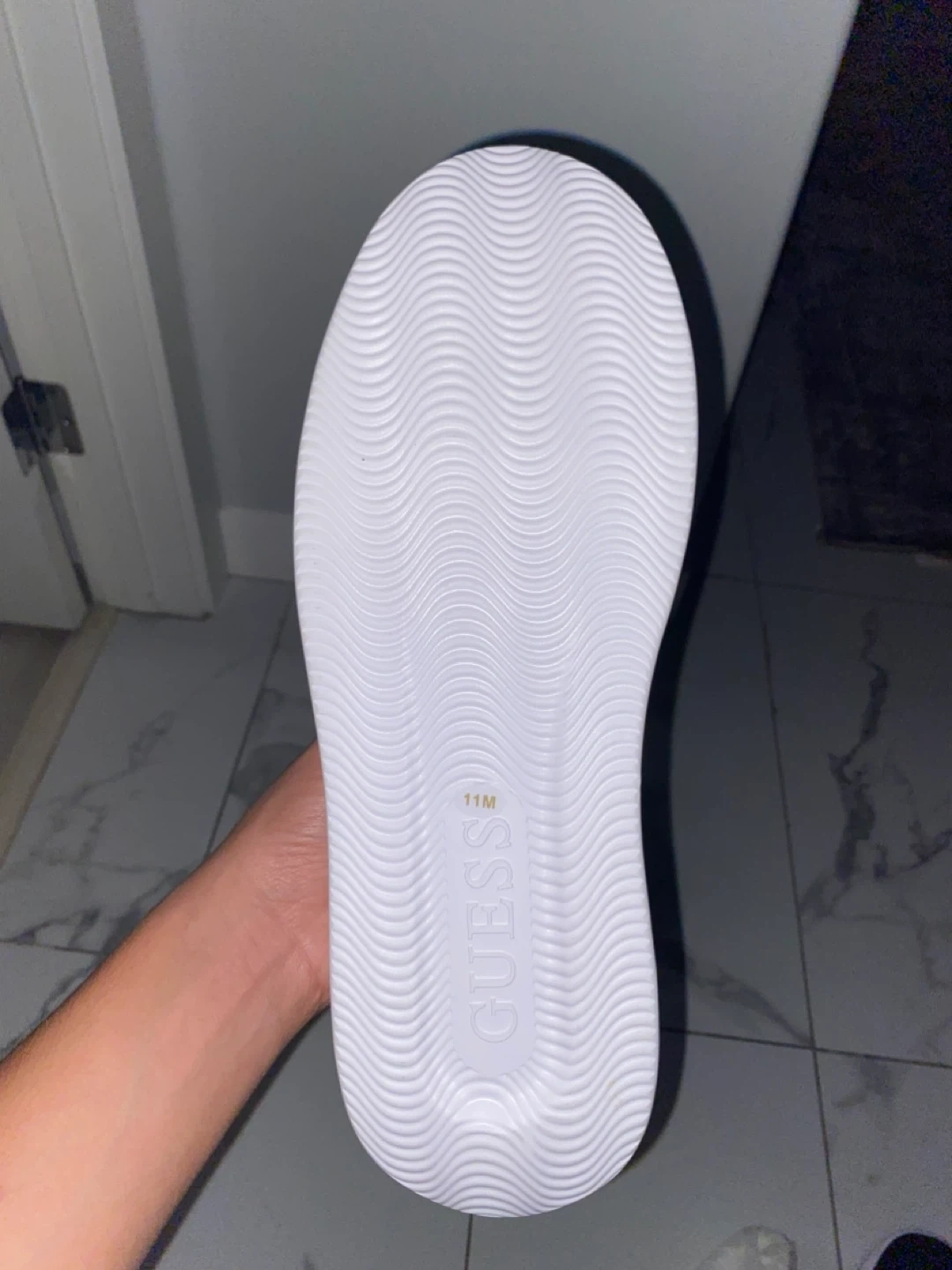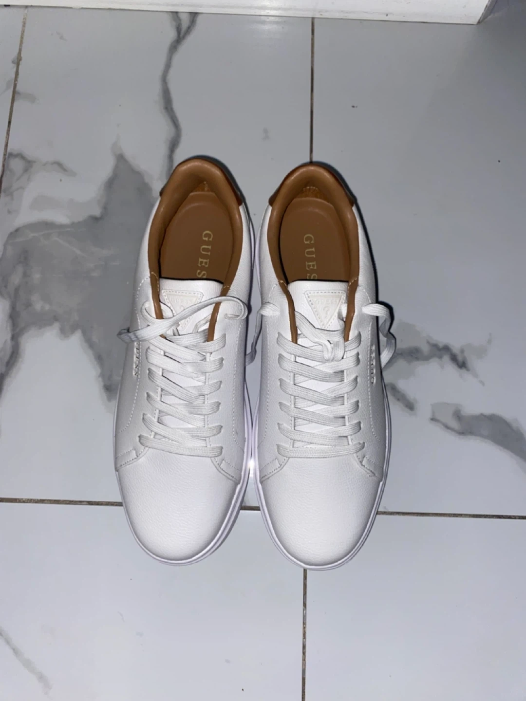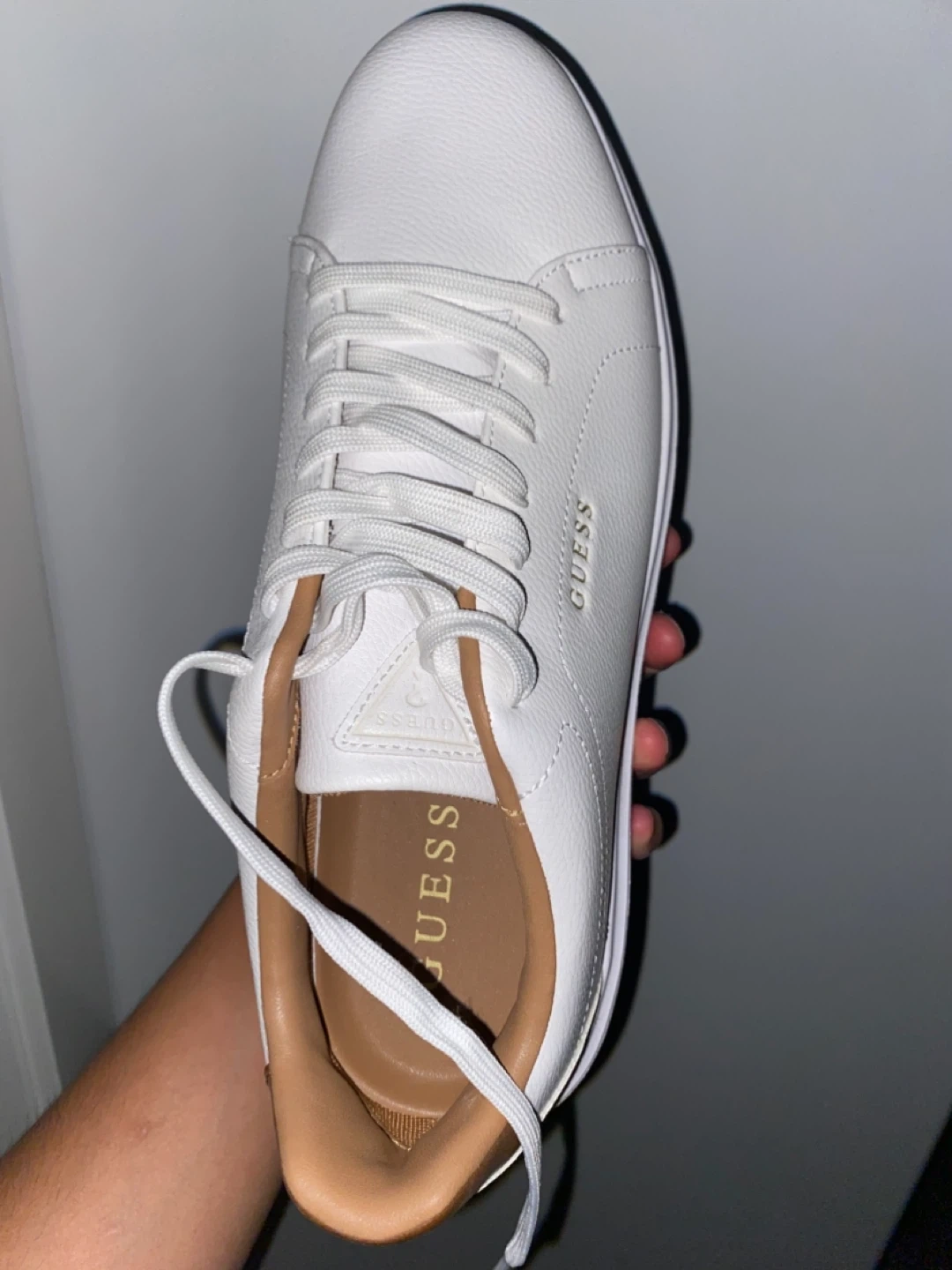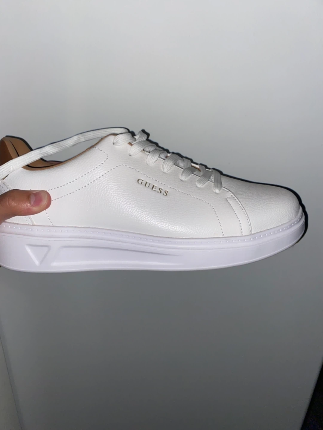 Selling a pair of Guess white leather sneakers in excellent condition! These stylish sneakers feature a classic design with a comfortable fit. The size is US 11. Perfect for everyday wear!
