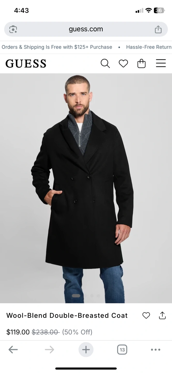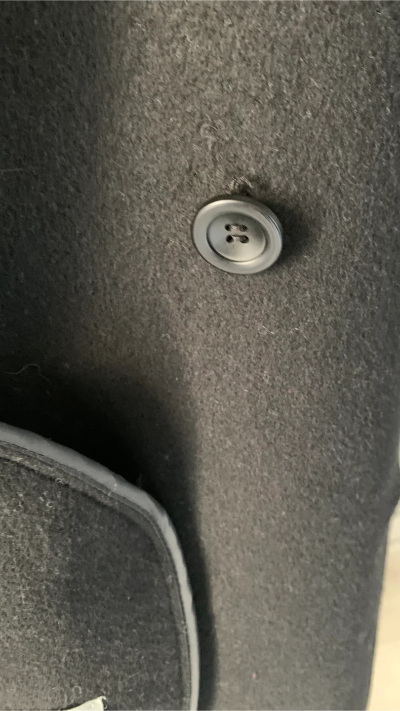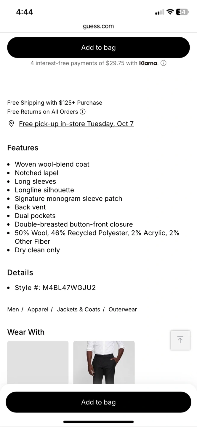Looking to sell a GUESS wool-blend double-breasted coat! It's a stylish black coat made of 50% wool, 46% recycled polyester, 2% acrylic, and 2% other fiber. This coat features a notched lapel, long sleeves, a longline silhouette, a signature monogram sleeve patch, a back vent, and dual pockets. It originally retailed for $238 cad.