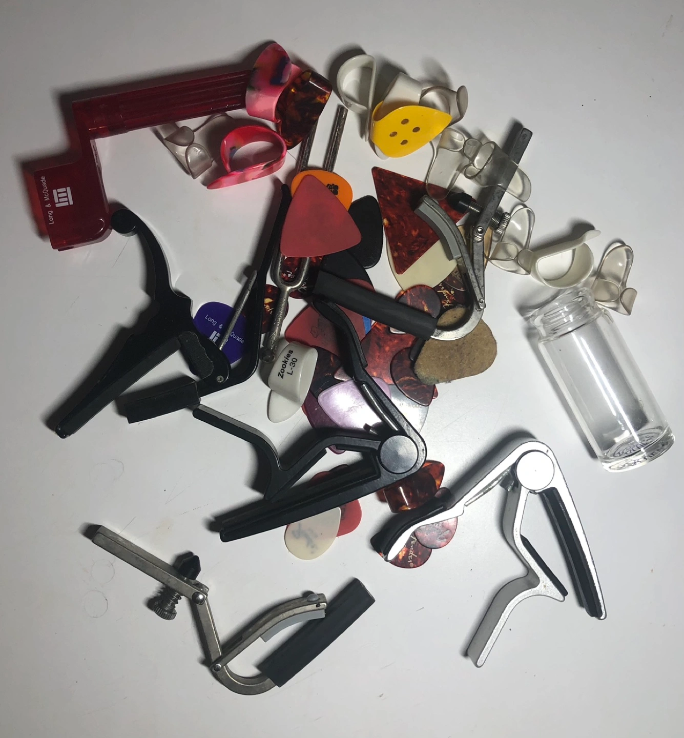 208Large lot of guitar accessories. Includes multiple capos and a variety of guitar picks. Some picks are branded. Also includes a slide, string winder and finger picks.