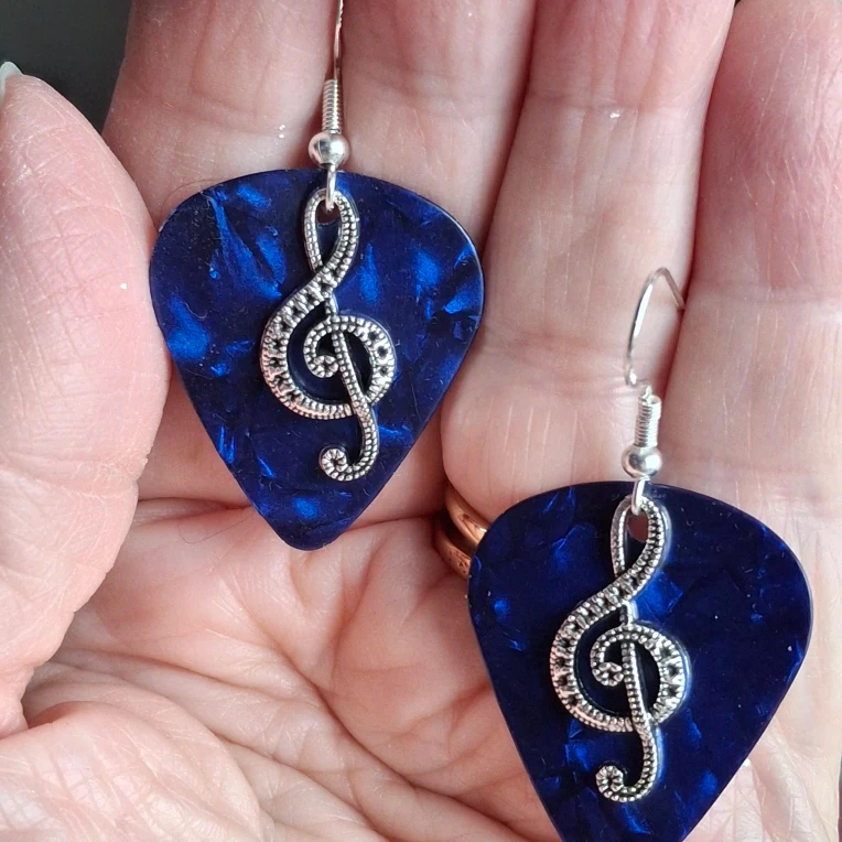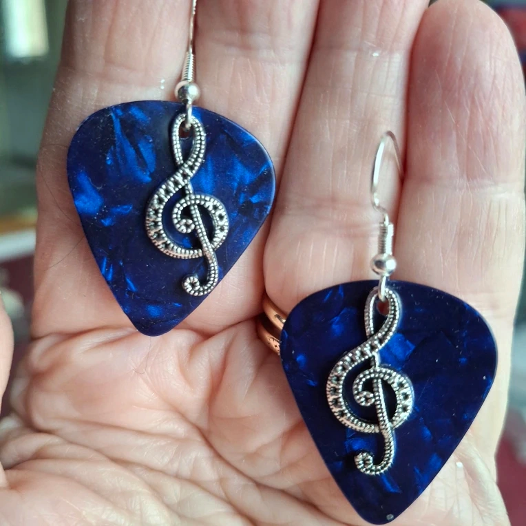 389These unique dangle earrings are made from guitar picks and feature a treble clef design. They are perfect for music lovers and add a touch of personality to any outfit