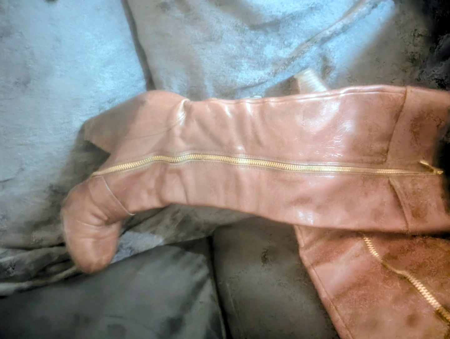 Brown leather knee-high boots with side zippers and buckle details. Heel height is approximately 3 inches. Shaft height is approximately 15 inches. Some signs of wear on the interior lining.