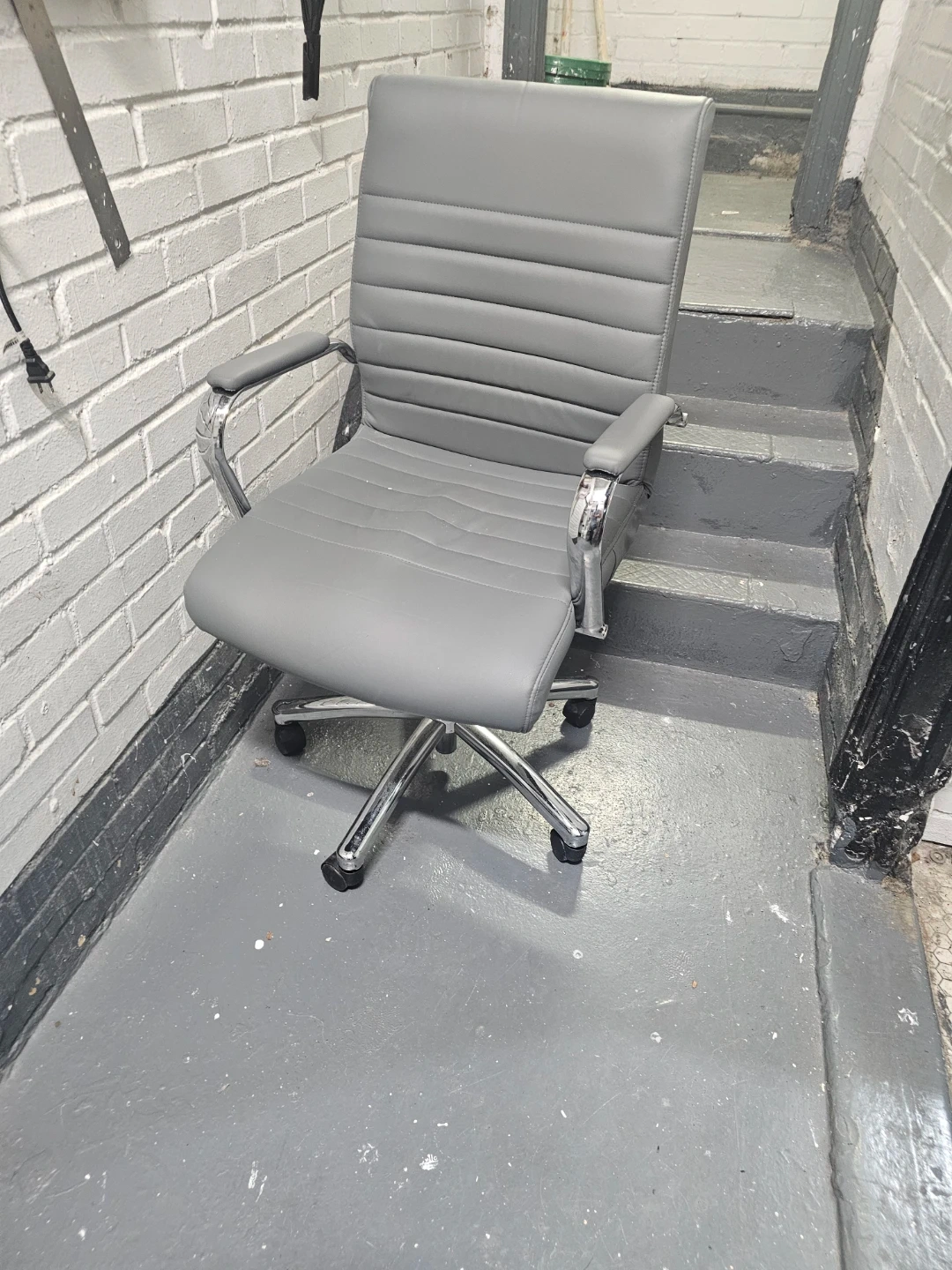 Gray faux leather office chair with a chrome base and wheels. It has a padded seat and back with horizontal stitching details. This chair offers adjustable height for comfortable seating.