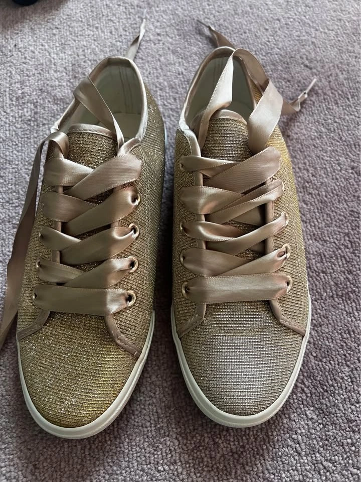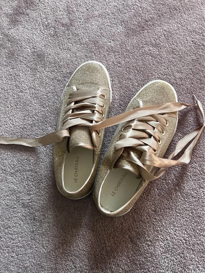 Le Chateau gold blinged out sneakers, worn once for graduation. Size 6. Clean with no scuffs or damage. Perfect for a young lady who wants comfort and bling!!