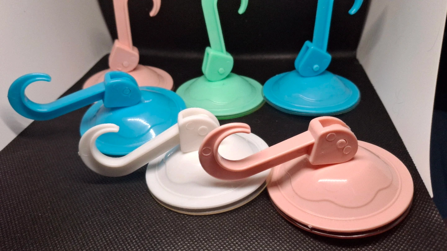 This is a set of six suction cup hooks in various colours. They're great for hanging lightweight items on smooth surfaces like tiles or glass. Includes pink, blue, green, and white hooks.