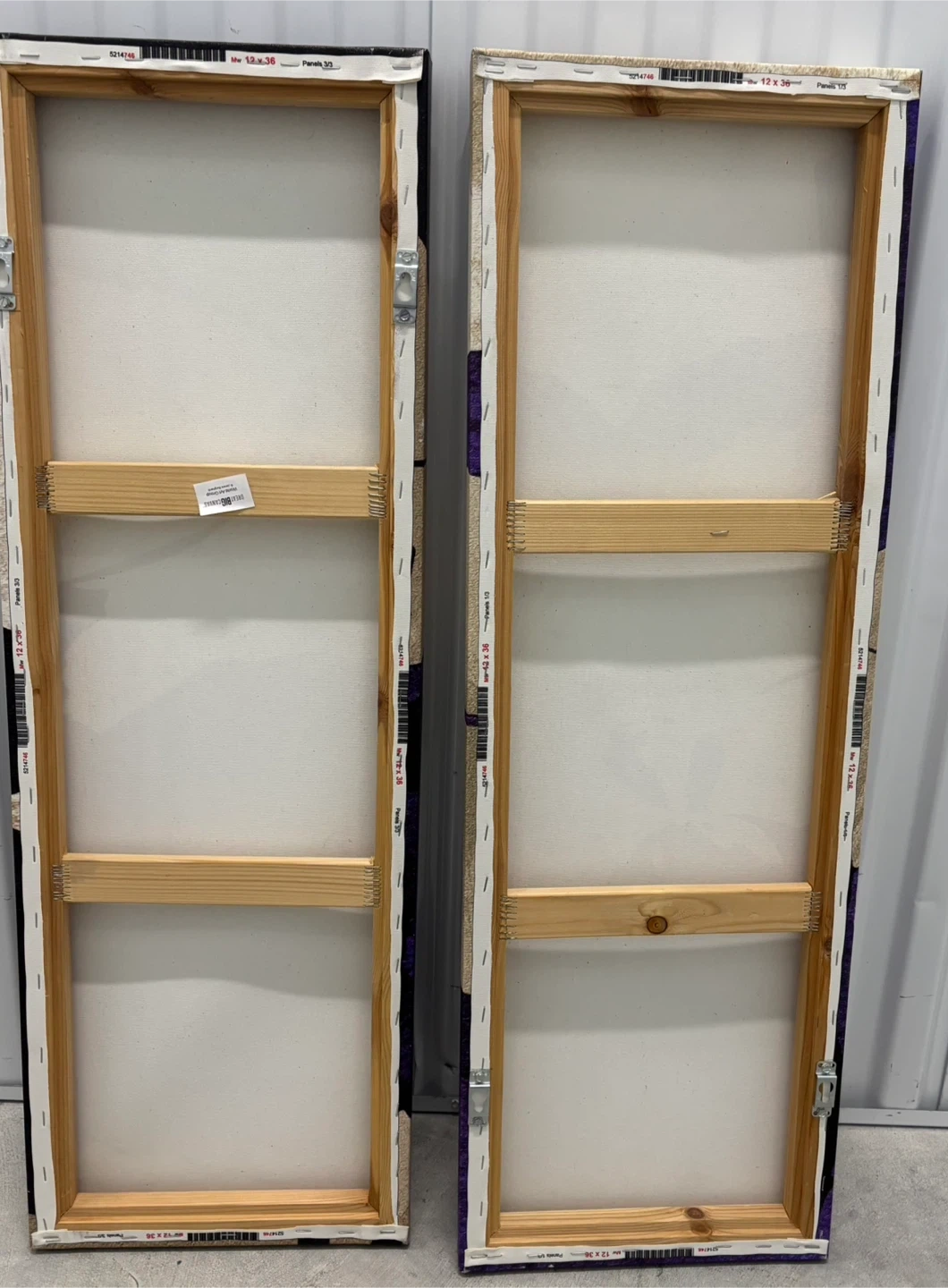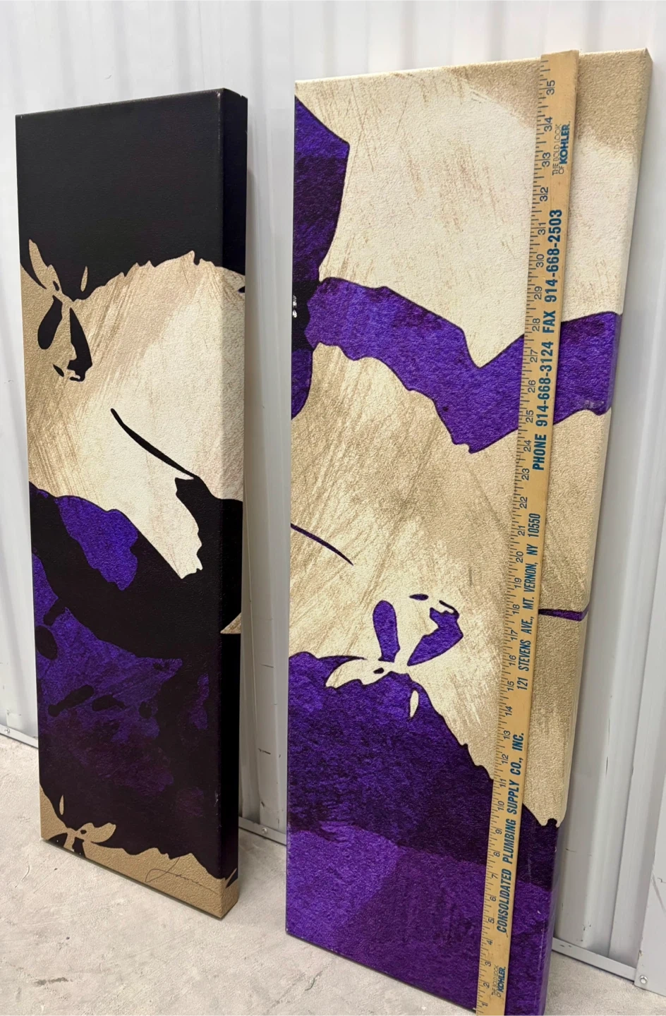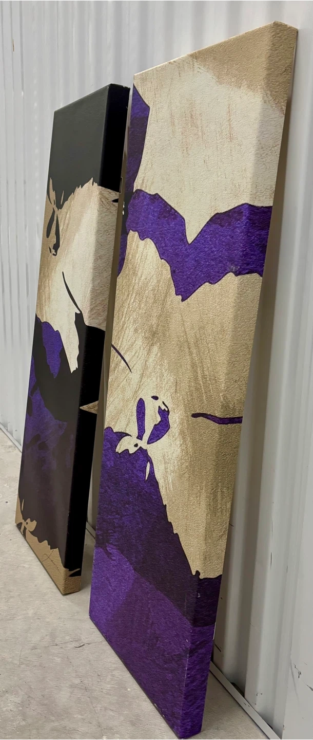 This set includes two abstract canvas wall art pieces. Features a bold design with purple, gold, and black tones. Canvas material stretched over wooden frames. Each piece measures approximately 12 inches wide and 36 inches tall.