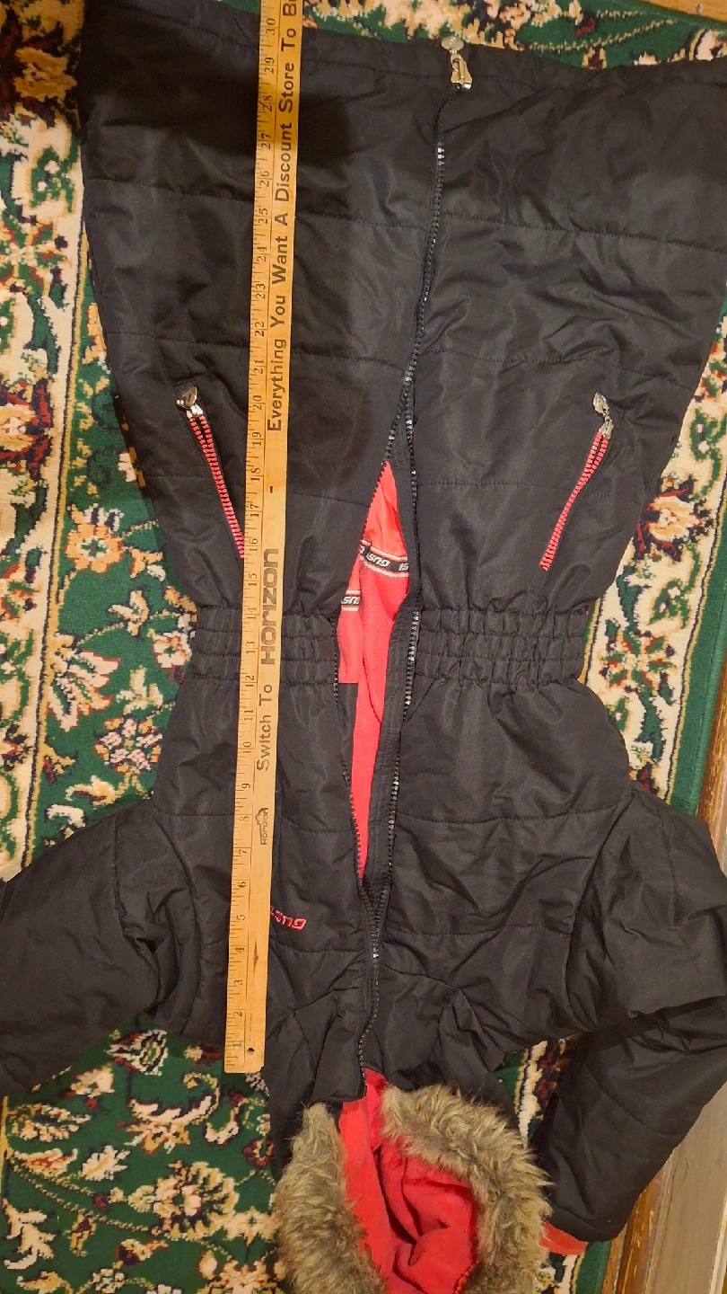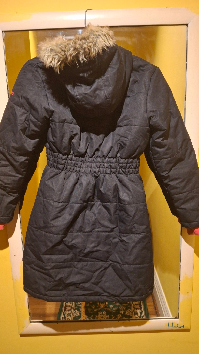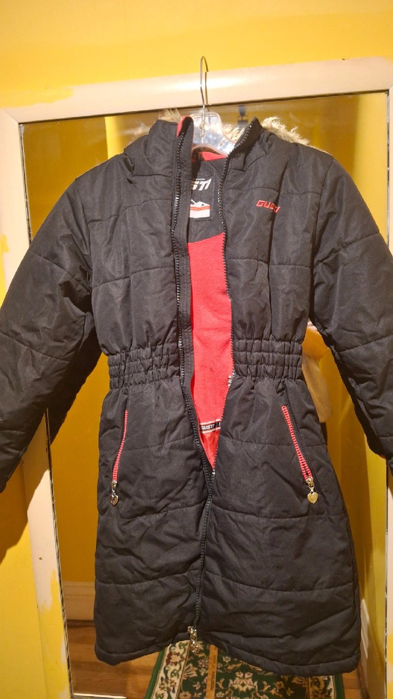Gusti winter jacket, perfect for keeping warm this winter! It's a size 7 and features a cozy fur-trimmed hood and a stylish black exterior with red accents. It's in great condition.