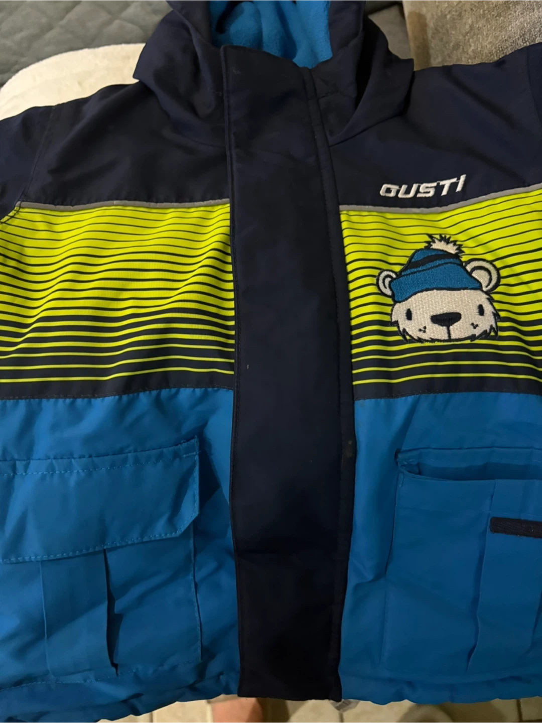 71Keep your little one warm this winter with this Gusti winter jacket! It's in great condition and features a fun design with a cute bear. The jacket is size 3T and has a vibrant blue and yellow colour scheme. Perfect for outdoor adventures!