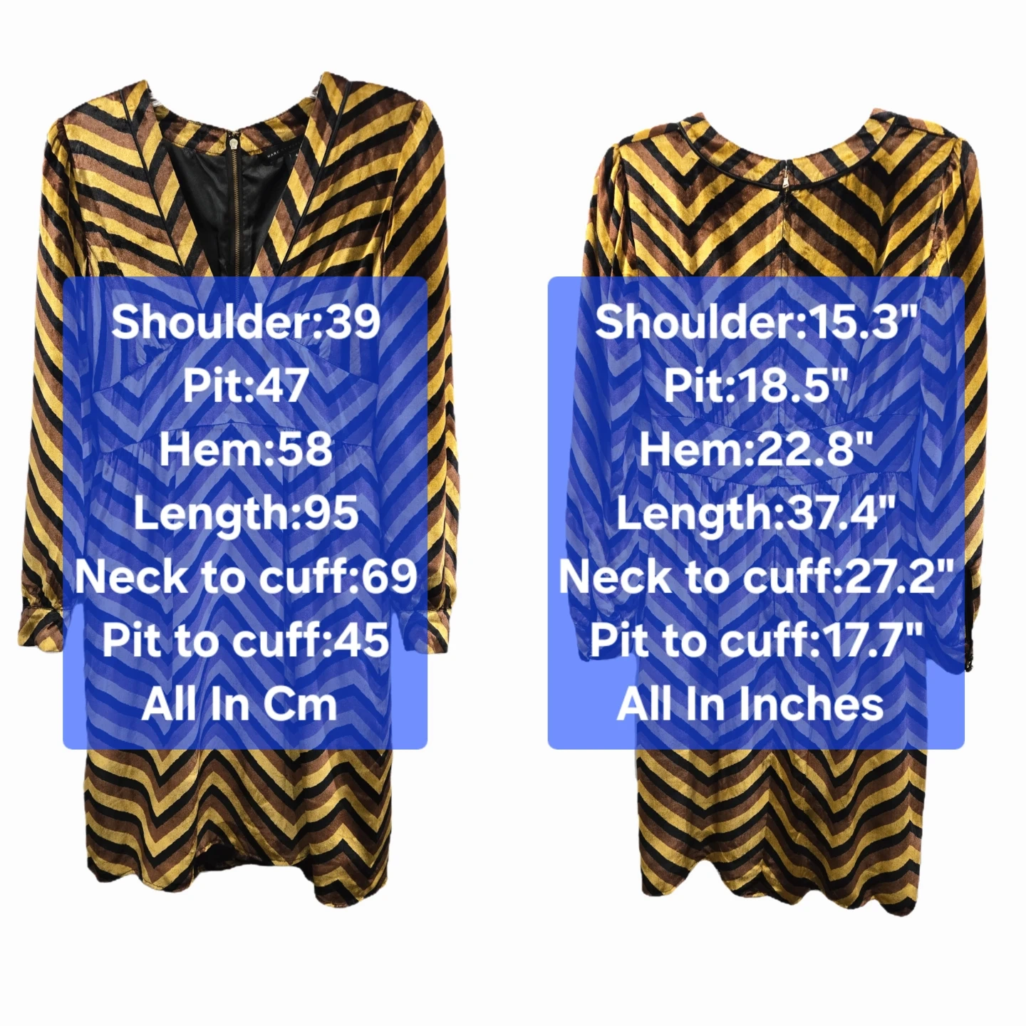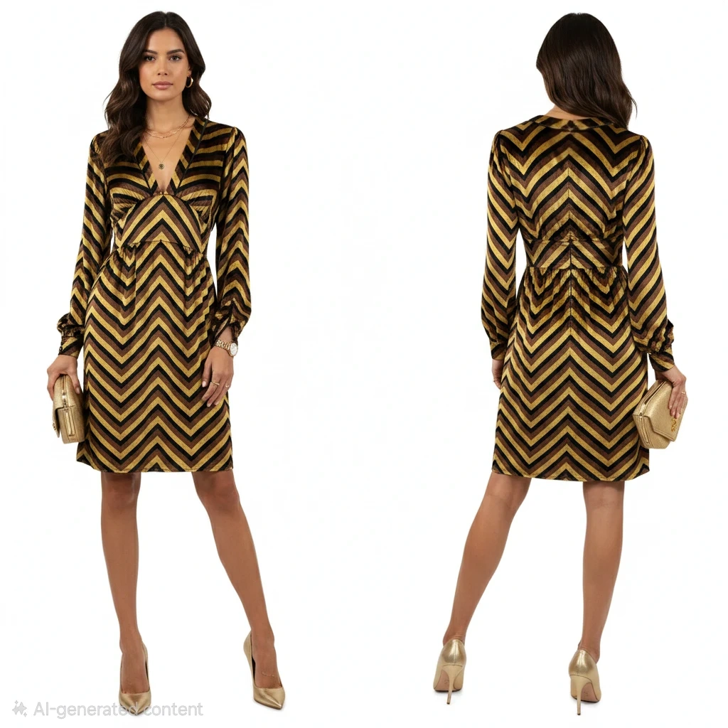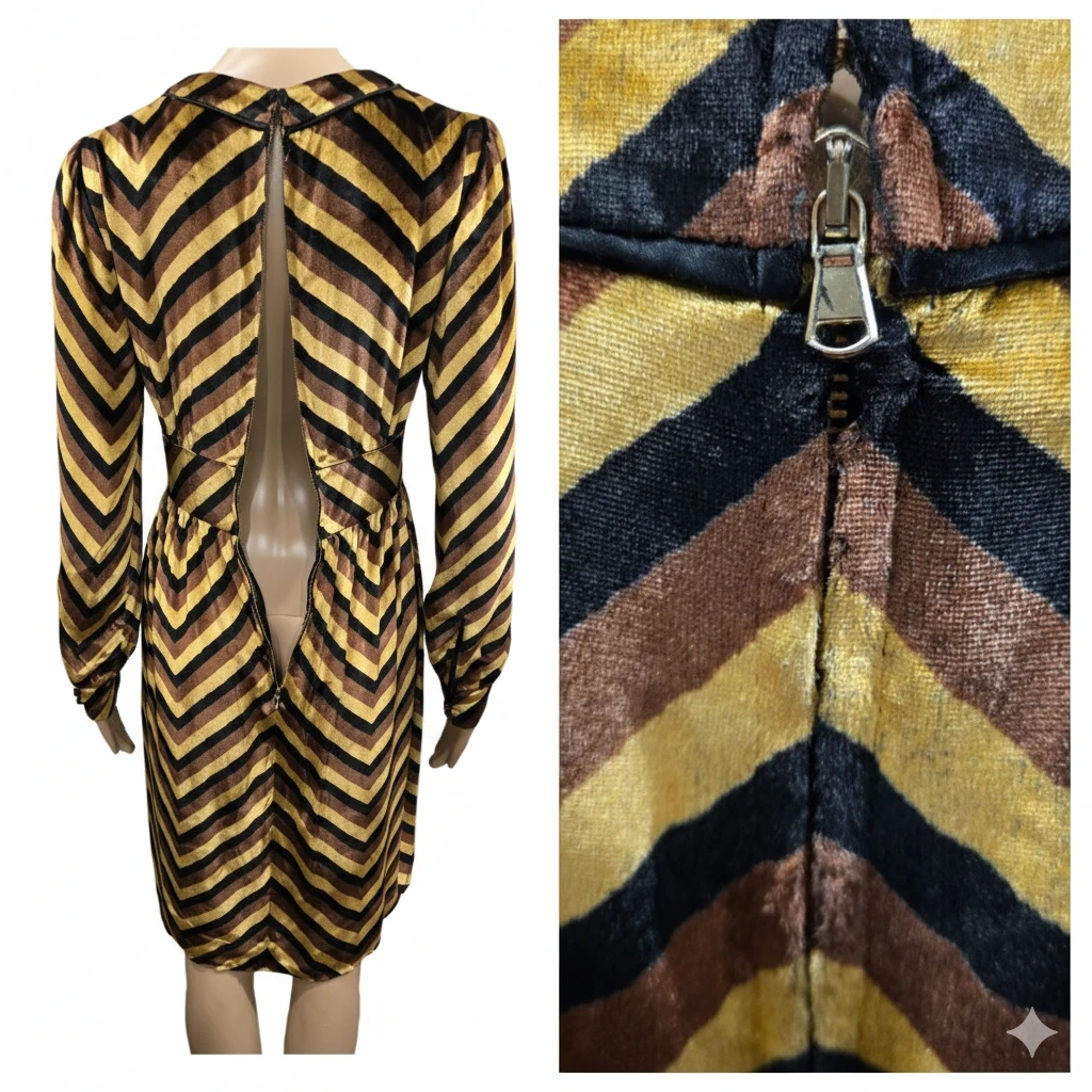 This dress features a striking mix of yellow gold, brown, and black tones with a luxurious texture. The silhouette features a deep V-neckline, long sleeves with buttoned cuffs, and a dramatic exposed back zipper. Fully lined.