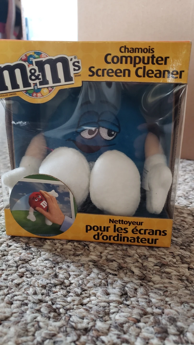 It's an M&M's branded chamois computer screen cleaner. The plush figure is blue. This item is new in box.