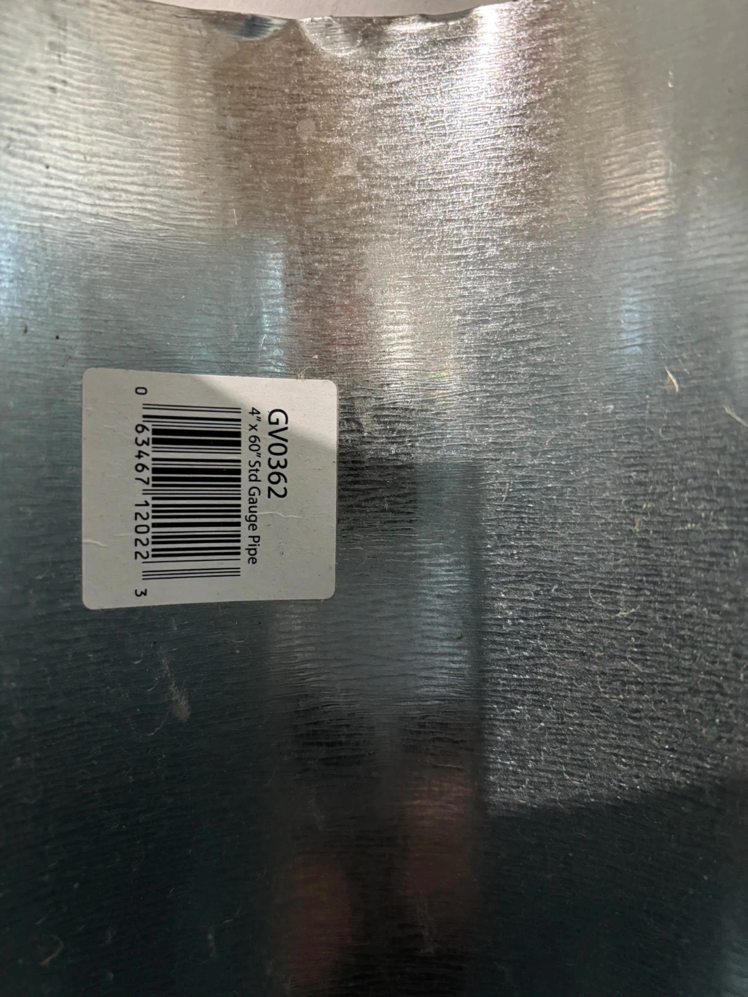 18Selling a GV0362 4"x60" galvanized steel gauge pipe, perfect for various projects, like heating or cooling piping in your house. Brand new, never used Pick up in St.Vital